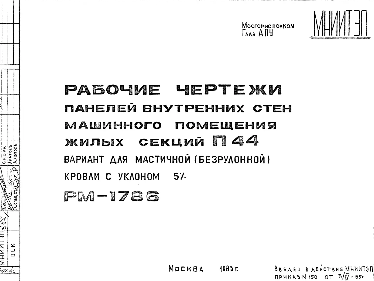 Шифр РМ-1786 Панели внутренних стен машинного помещения жилых секций П44 (вариант для мастичной (безрулонной) кровли с уклоном 5% (1985 г.)