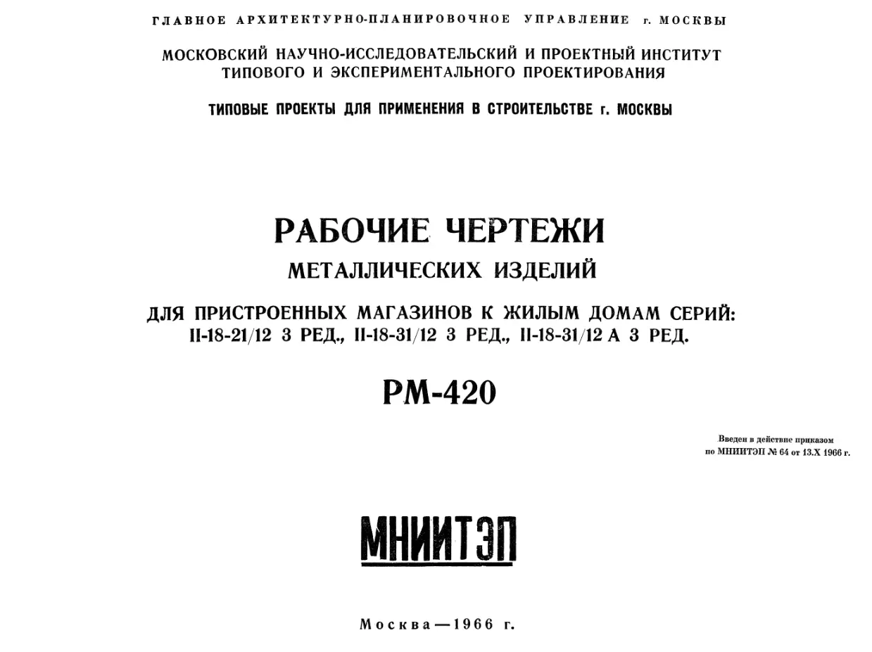 Шифр РМ-420 Металлические изделия для пристроенных магазинов к жилым домам серий: II-18-21/12 3 ред. ; II-18-31/12 3 ред.; II-18-31/12А (1966 г.)