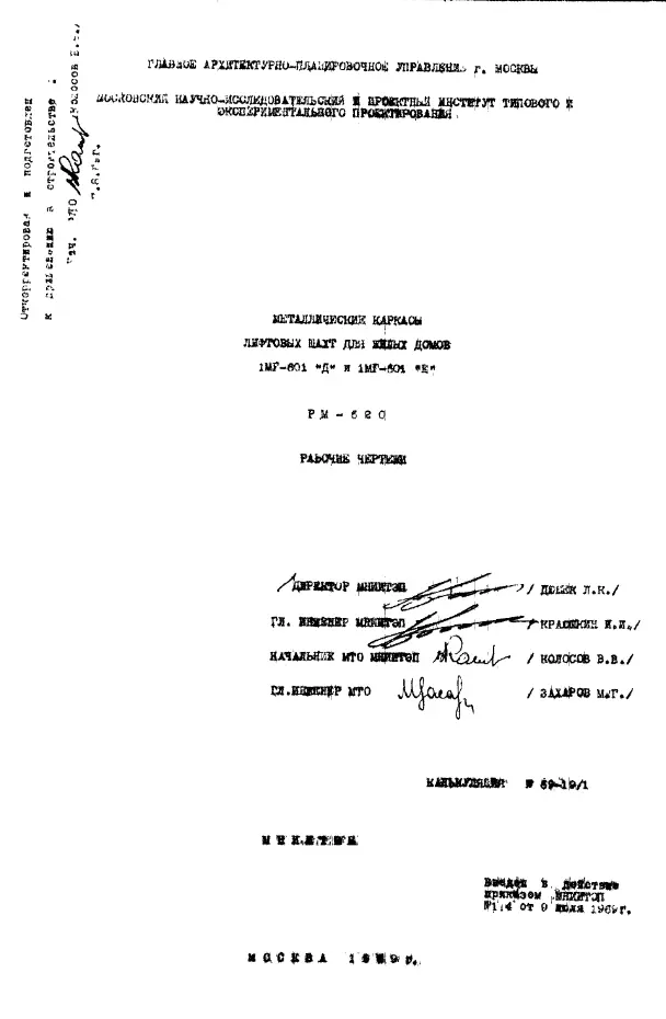 Шифр РМ-620 Металлические каркасы лифтовых шахт для жилых домов 1МГ-601 "Д" и 1МГ-601 "Е" (1969 г.)