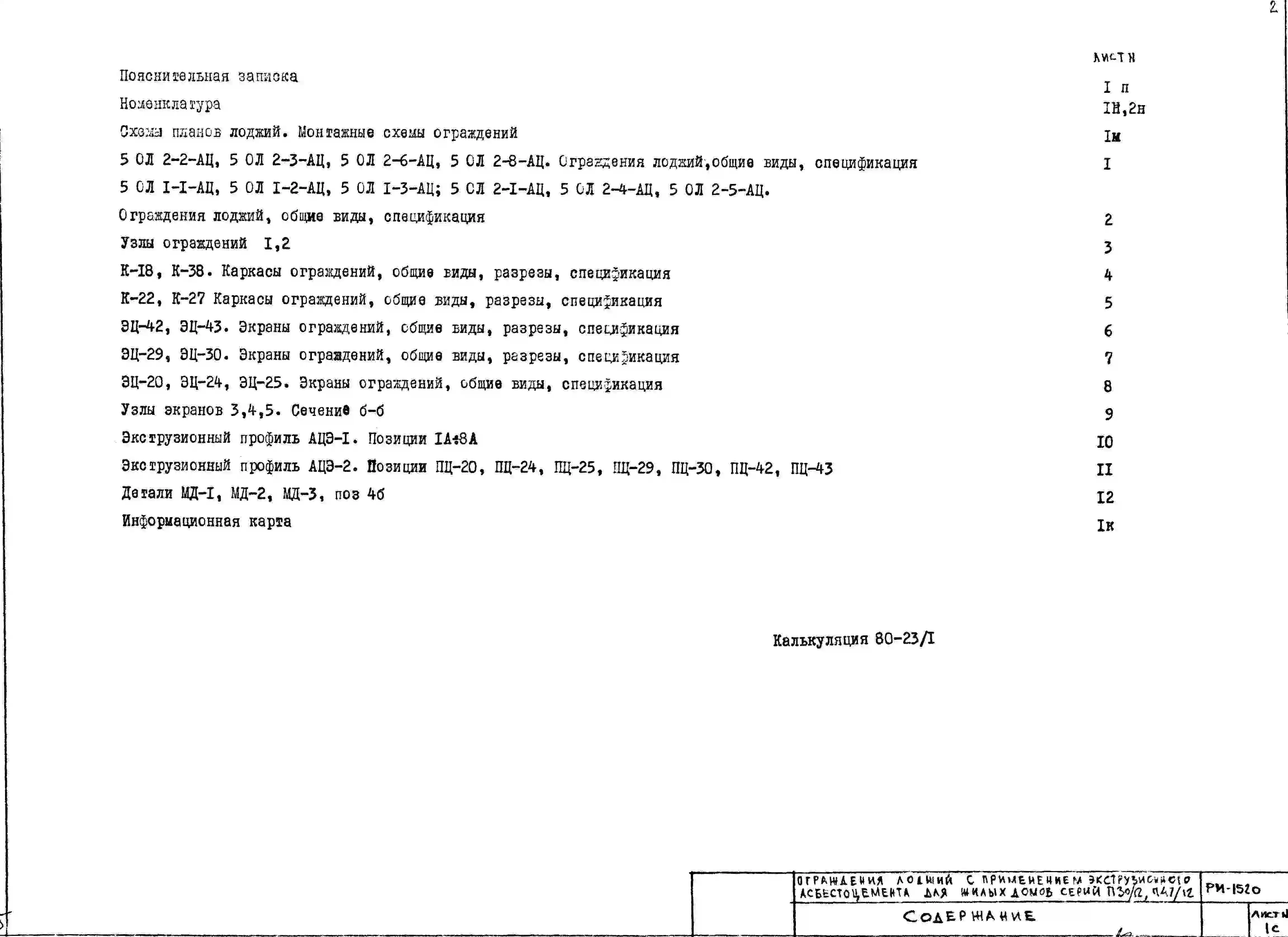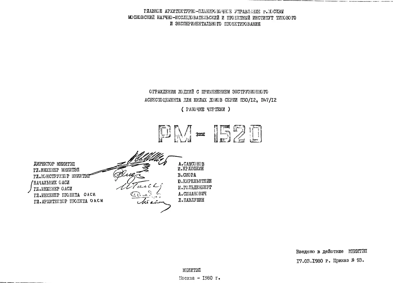 Шифр РМ-1520 Ограждения лоджий с применением экструзионного асбестоцемента для жилых домов серии П30/12, П47/12 (1980 г.)