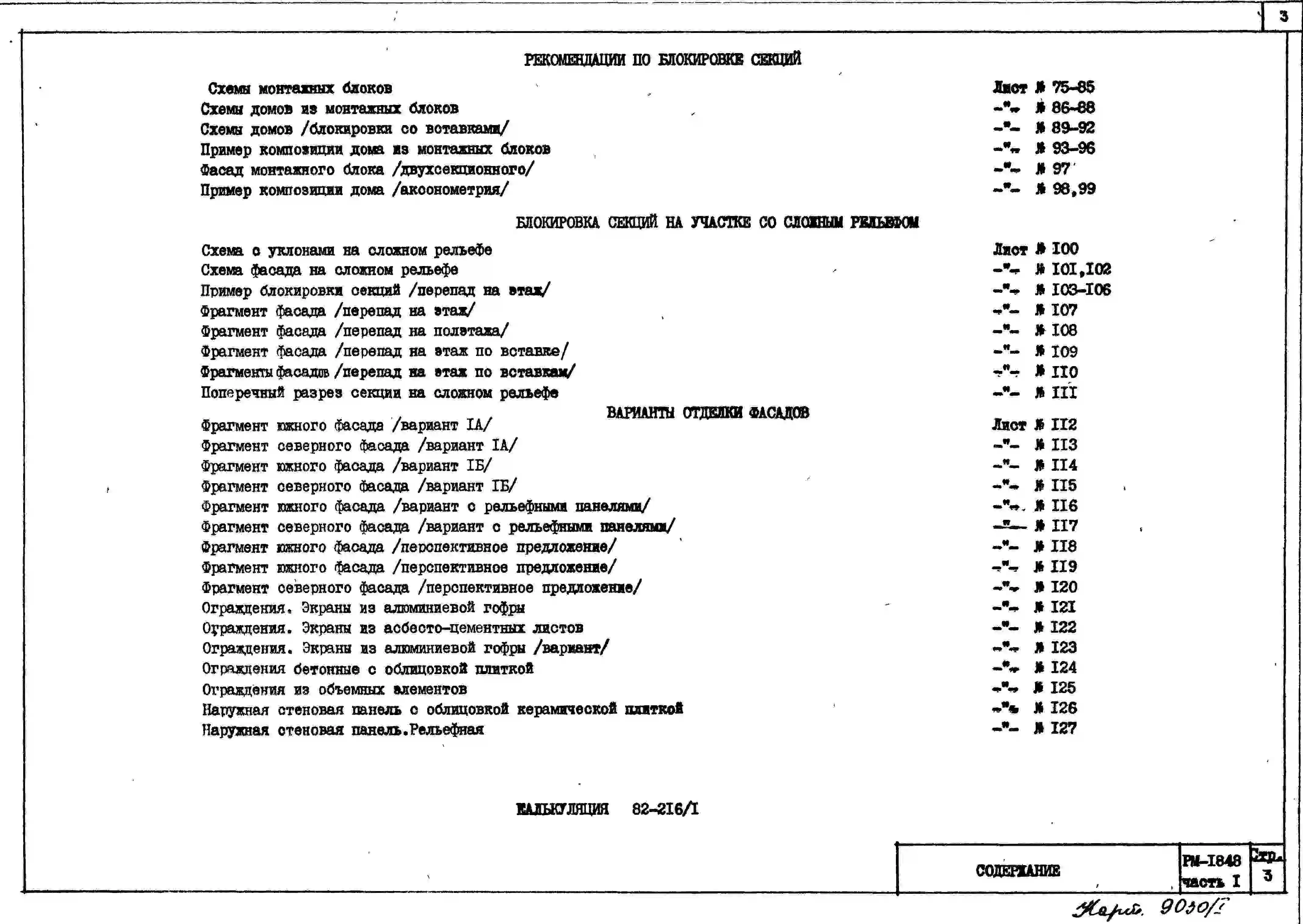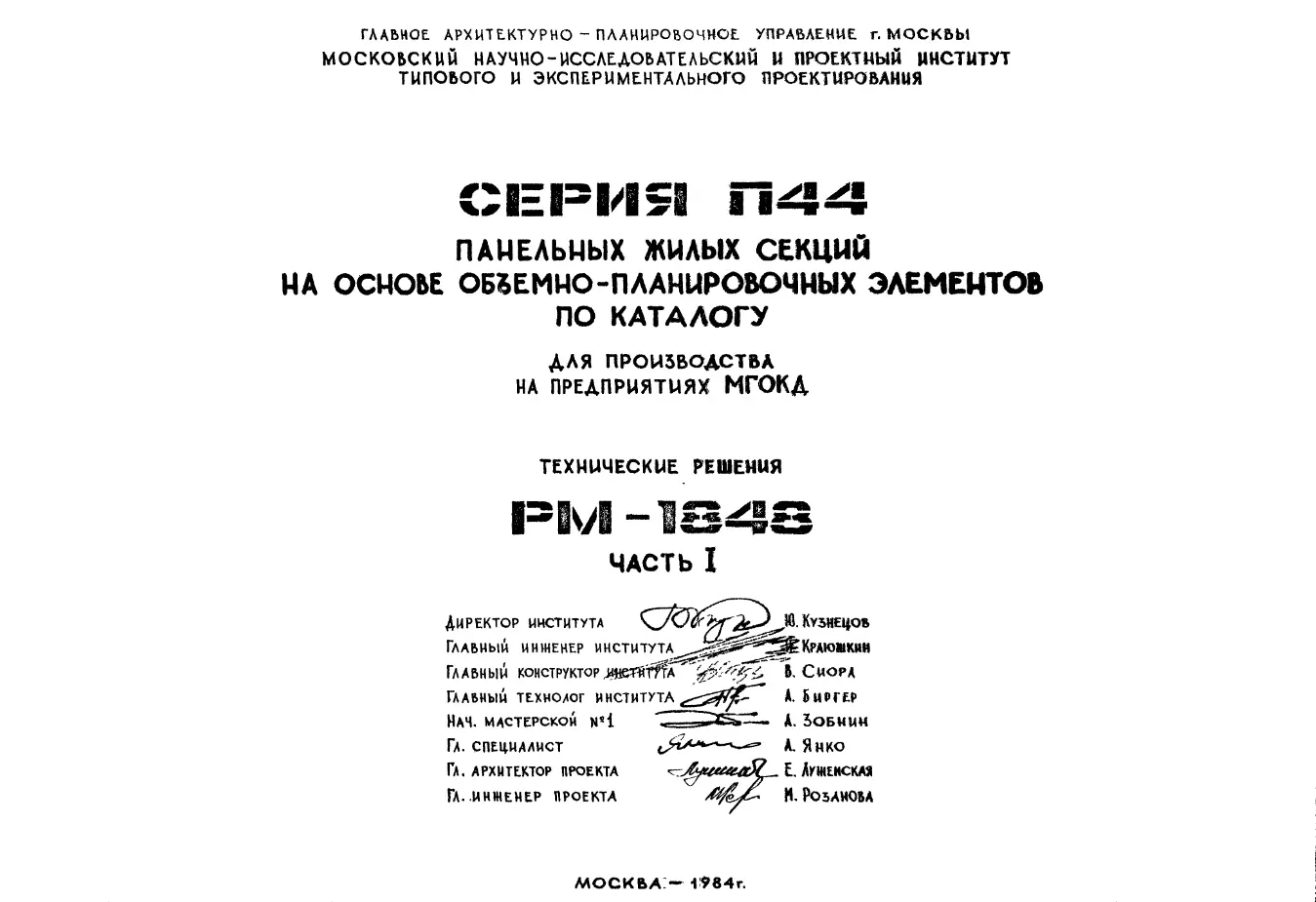 Шифр РМ-1848 Серия П44 панельных жилых секций на основе объемно-планировочных элементов по каталогу (для производства на предприятиях МГОКД) (1984 г.)