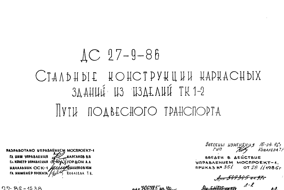 Шифр ДС 27-9-86 Стальные конструкции каркасных зданий из изделий ТК1-2. Пути подвесного транспорта