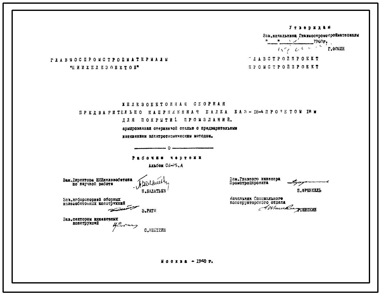 Шифр СК-25А Железобетонная сборная предварительно напряженная балка БАЭ-18-4 пролетом 18 м для покрытий промзданий, армированная стержневой сталью с предварительным натяжением электротермическим методом (1960 г.)
