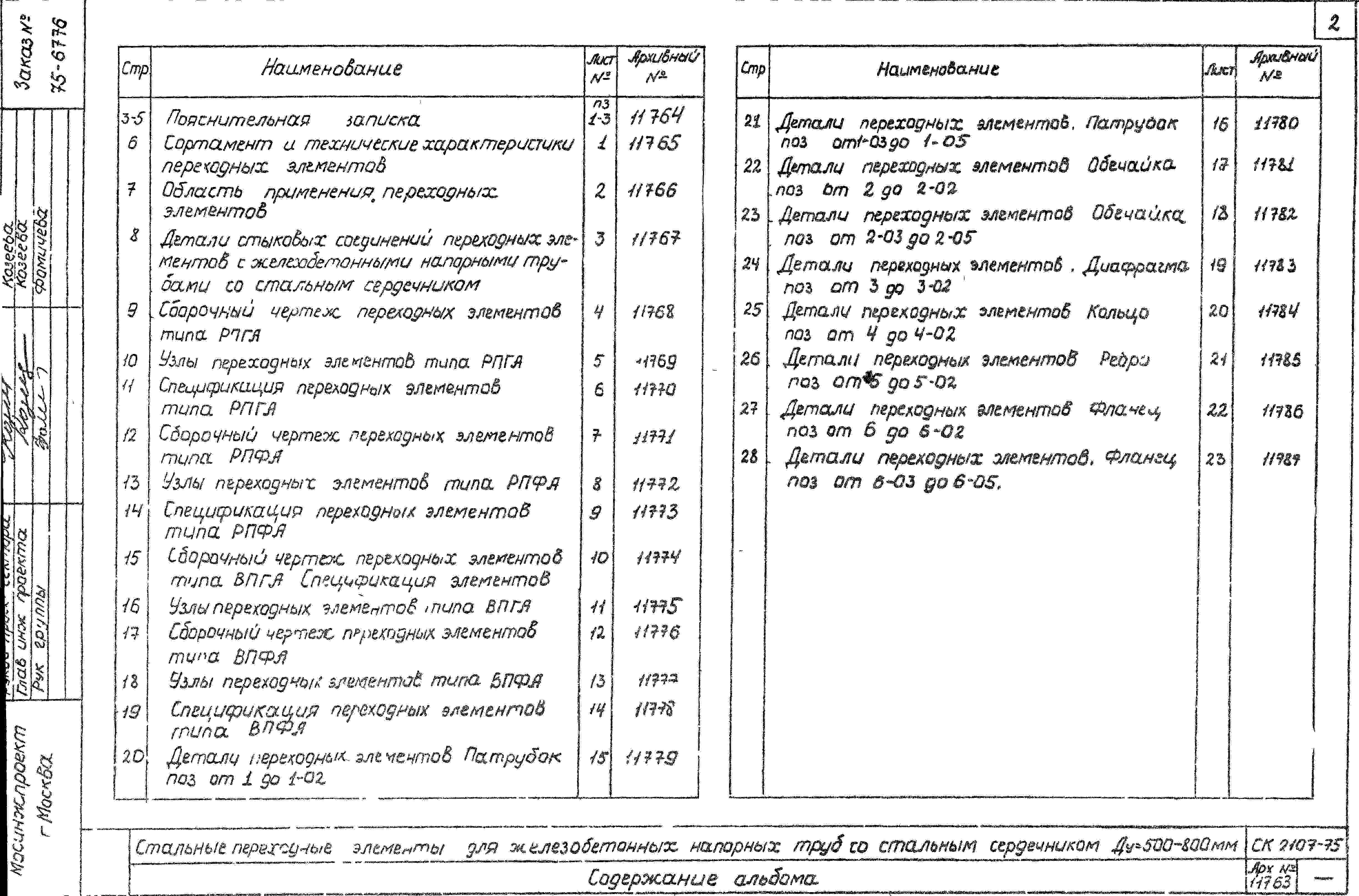 Шифр СК2107-75 Стальные переходные элементы для железобетонных напорных труб со стальным сердечником Ду = 500?800 мм (1975 г.)