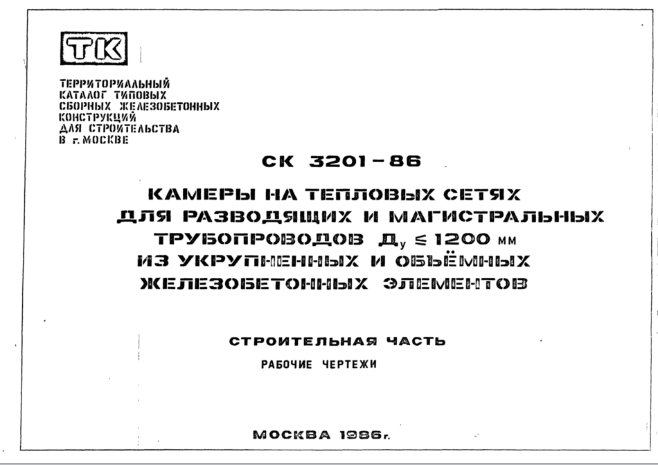 Шифр СК3201-86 Камеры на тепловых сетях для разводящих и магистральных трубопроводов Ду ? 1200 мм из укрупненных и объемных железобетонных элементов (1986 г.)