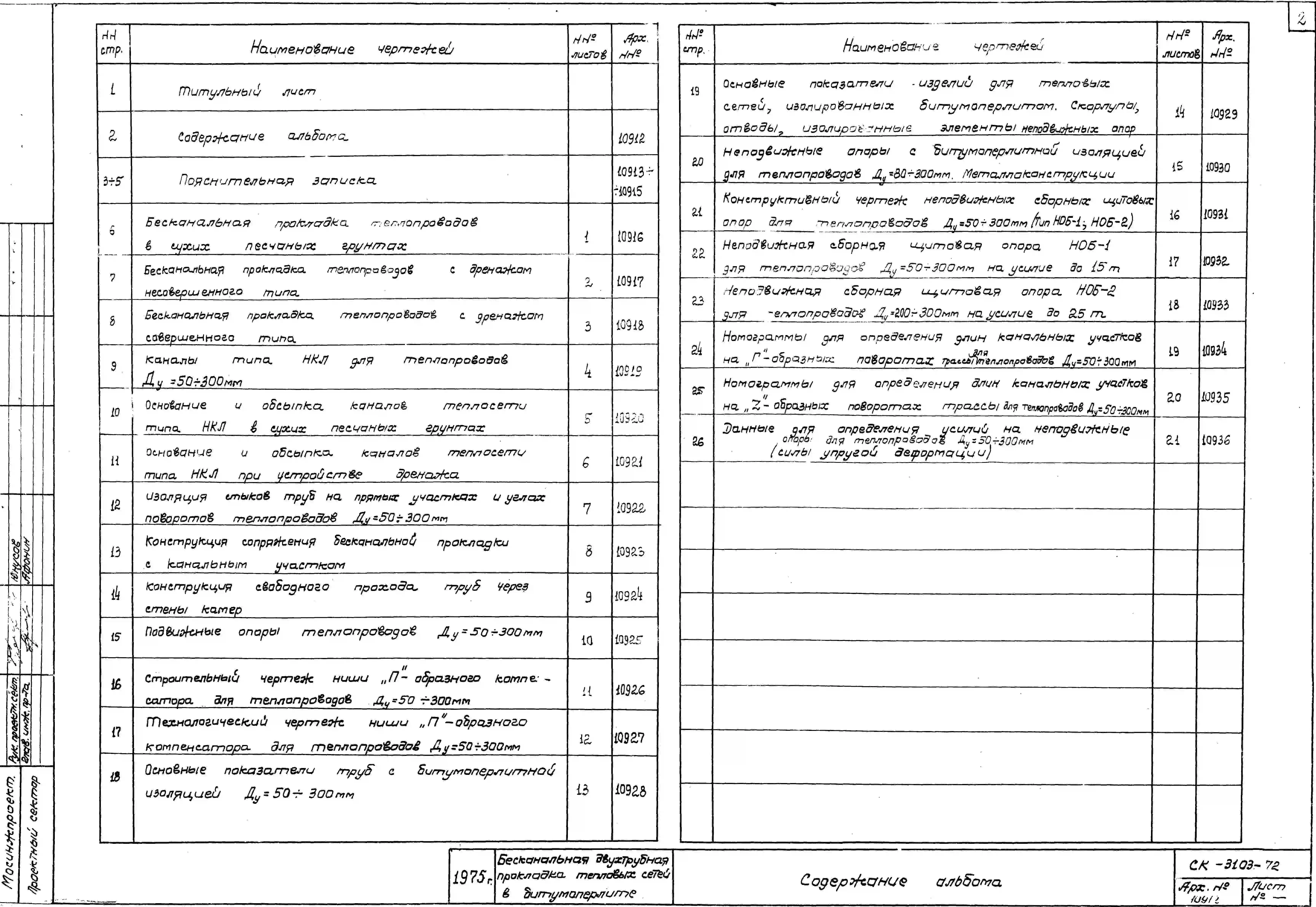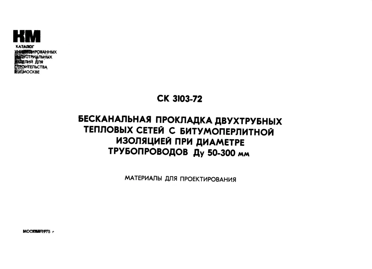 Шифр СК 3103-72 Бесканальная прокладка двухтрубных тепловых сетей с битумоперлитной изоляцией при диаметре трубопроводов Ду 50-300 мм (1975 г.)