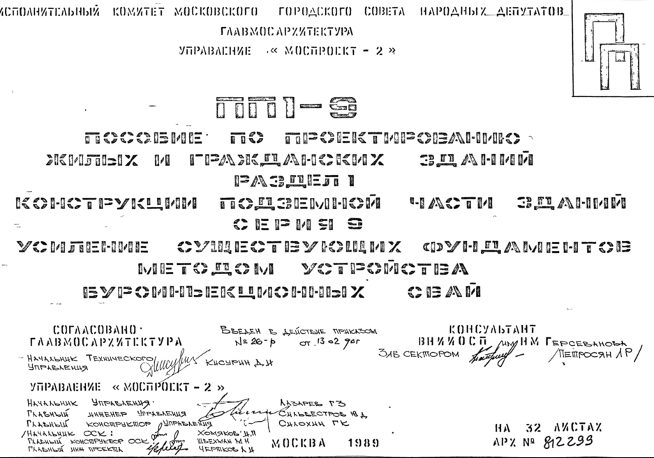 Шифр Раздел 1 Серия 9 Конструкции подземной части зданий. Усиление существующих фундаментов мотодом устройства буроинъекционных свай. Пособие по проектированию жилых и гражданских зданий. ПП1-9 (1989 г.)