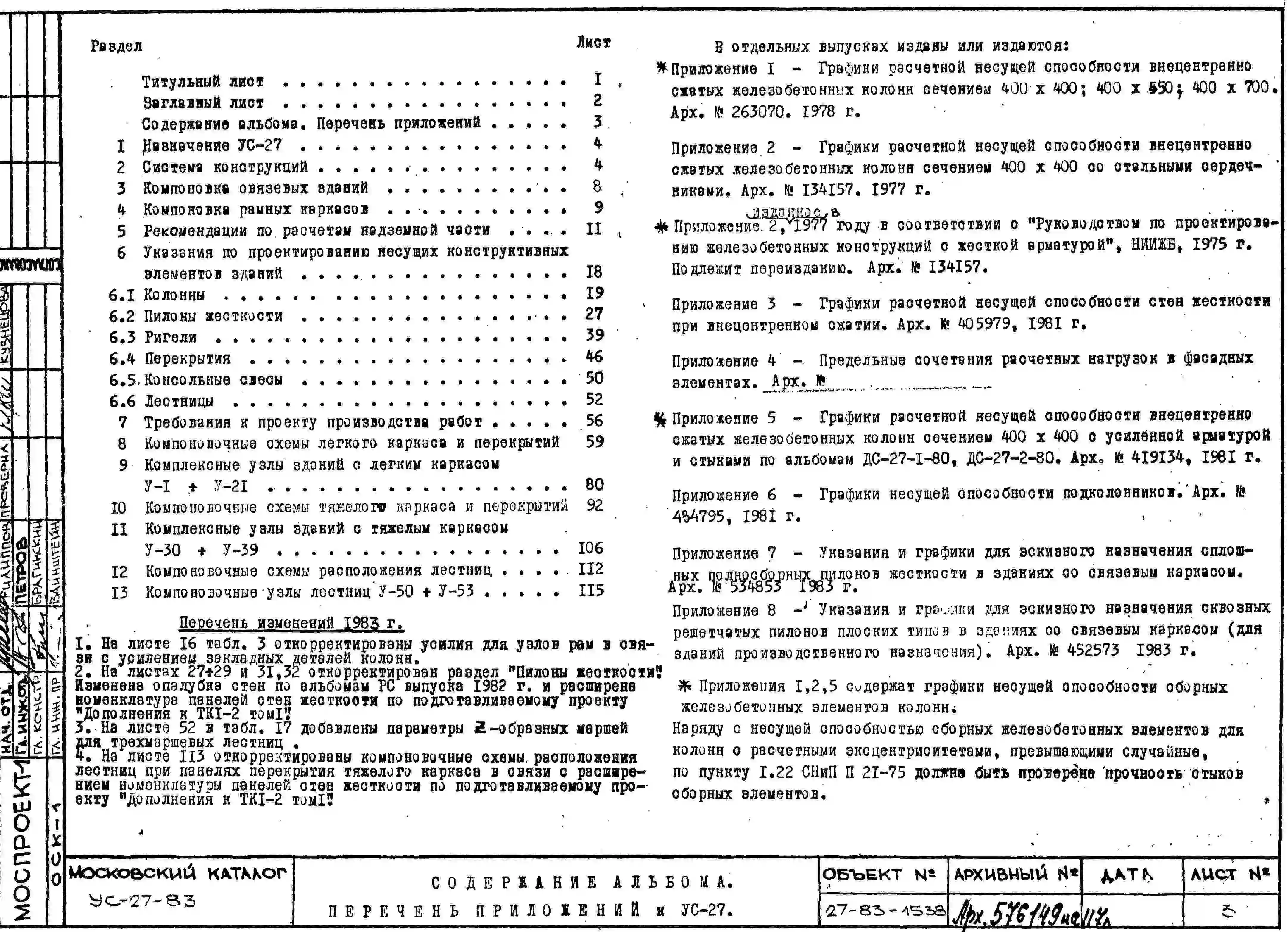 Шифр УС-27-83 Указания по проектированию несущих конструкций надземной части каркасных зданий из изделий каталога ТК1-2 (1983 г.)
