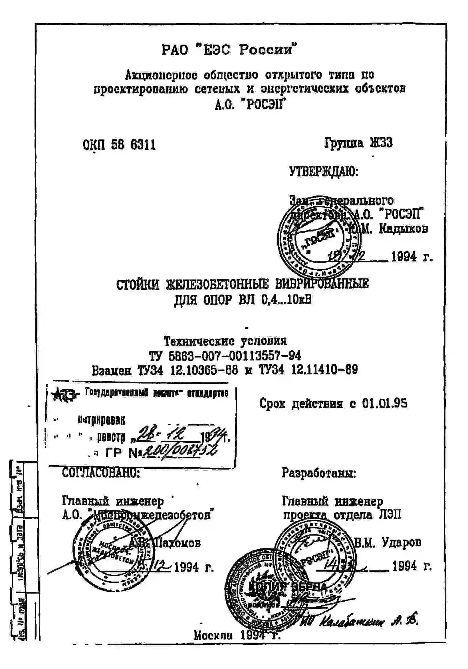 Шифр ТУ 5863-007-00113557-94 Технические условия «Стойки железобетонные вибрированные для опор ВЛ 0,4-10 кВ»