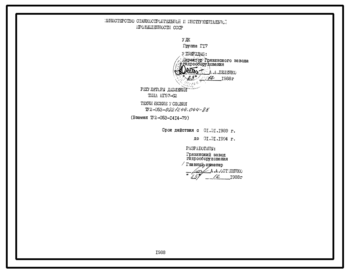 Шифр ТУ2-053-0221244.044-88 Регуляторы давления типа ПГ57-62