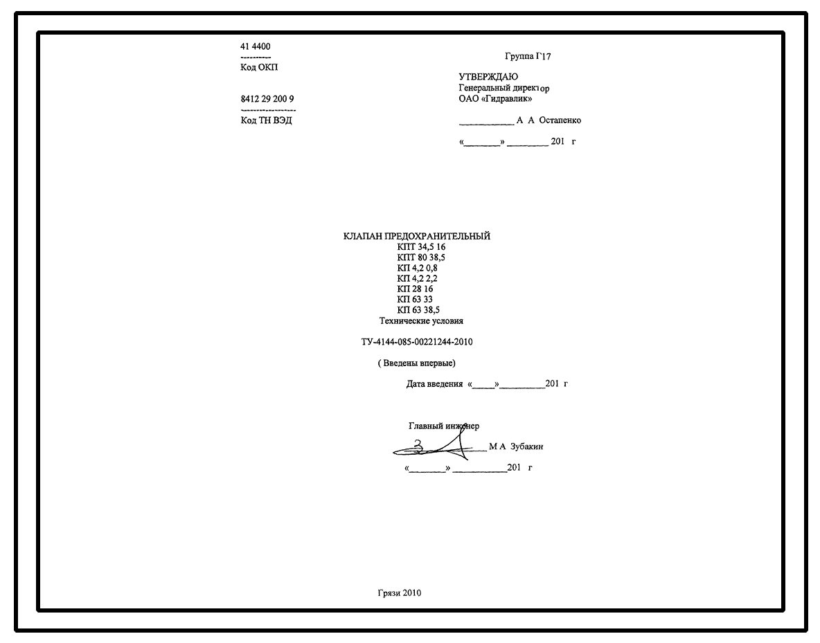 Шифр ТУ-4144-085-00221244-2010 Клапан предохранительный КПТ34,5.16;КПТ80.38,5;КП4,2.0,8;КП28.16;КП63.33;КП63.38,5