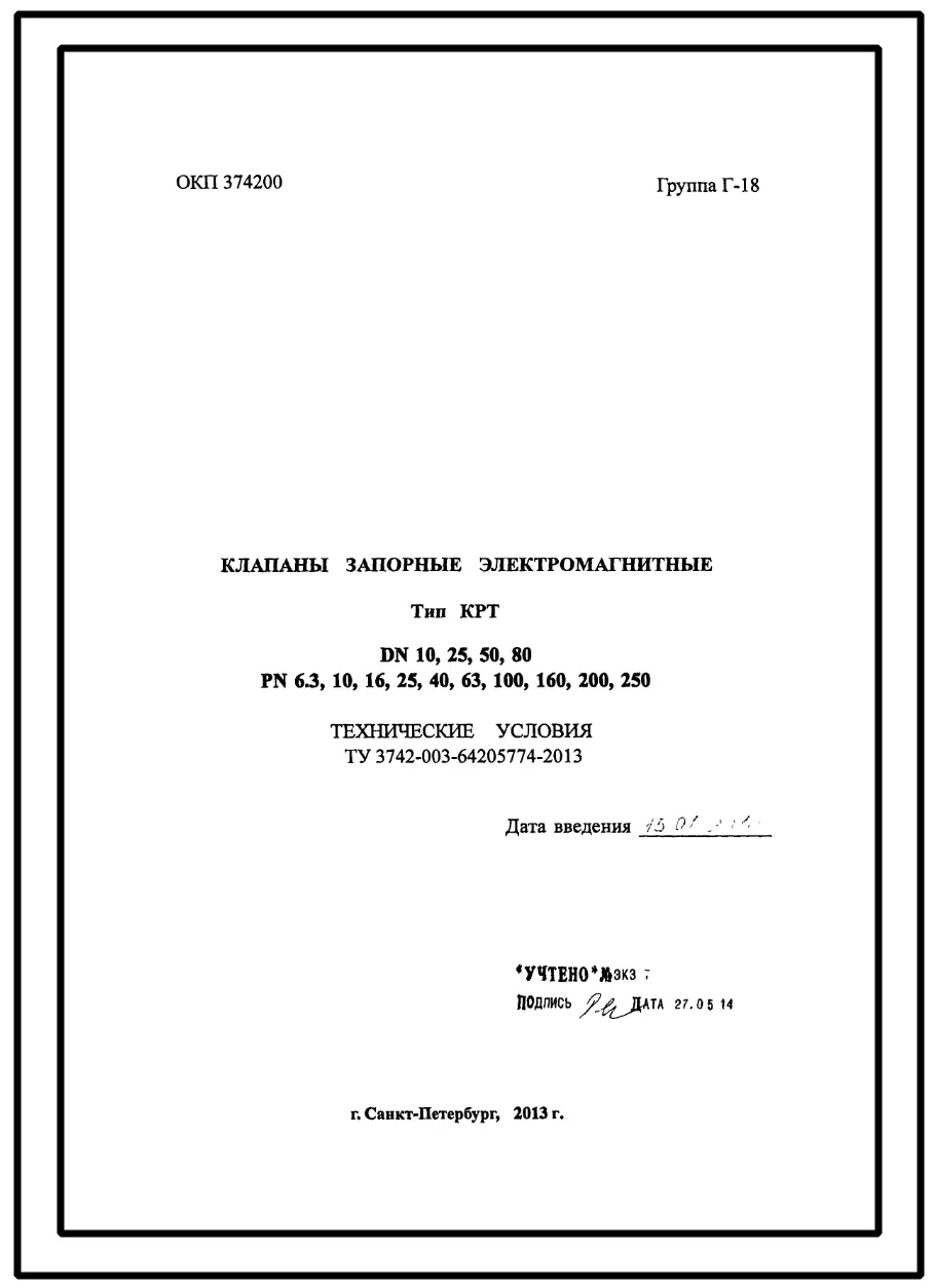 Шифр ТУ3742-003-64205774-2013 Клапаны запорные электромагнитные .(Технические условия).