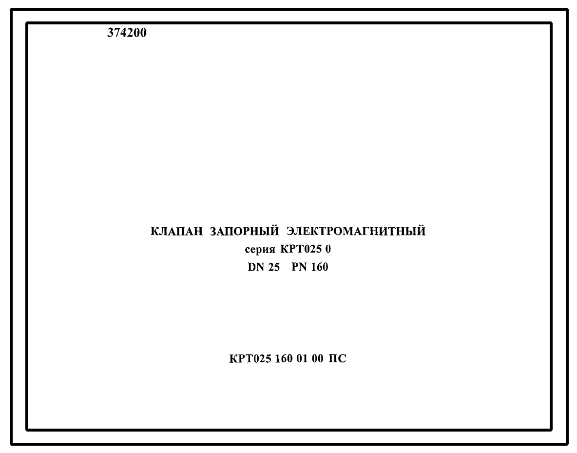 Шифр КРТ025.160.01.00 ПС Клапан запорный электромагнитный серия КРТ025.0 DN25 PN160