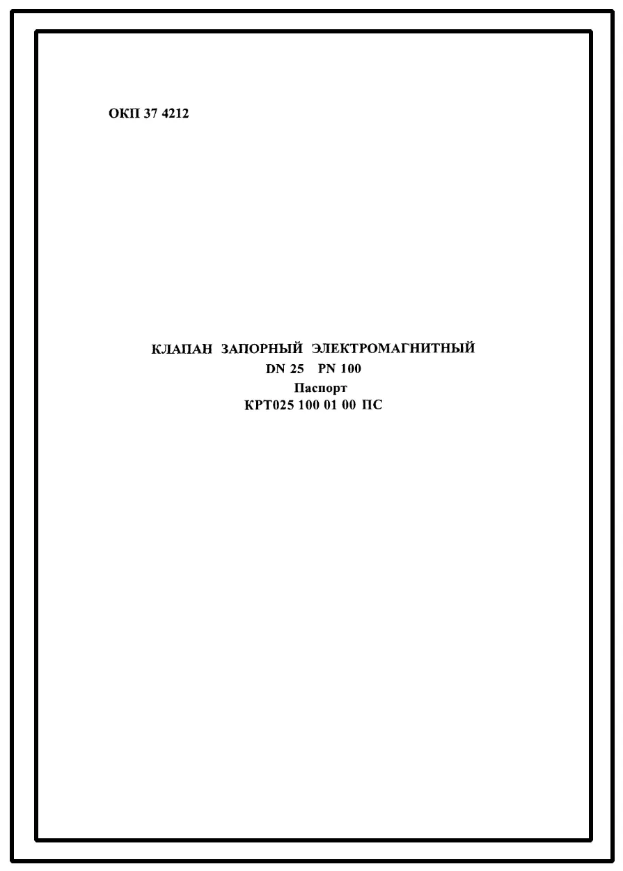 Шифр КРТ025.100.01.00ПС Клапан запорный электромагнитный КРТ025.100.01.00ПС.(Паспорт).