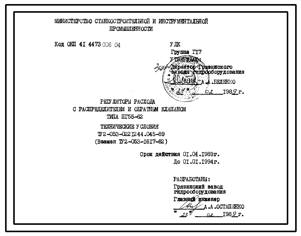 Шифр ТУ2-053-0221244.045-89 Регуляторы расхода с распределителем и обратным клапаном типа ПГ55-62