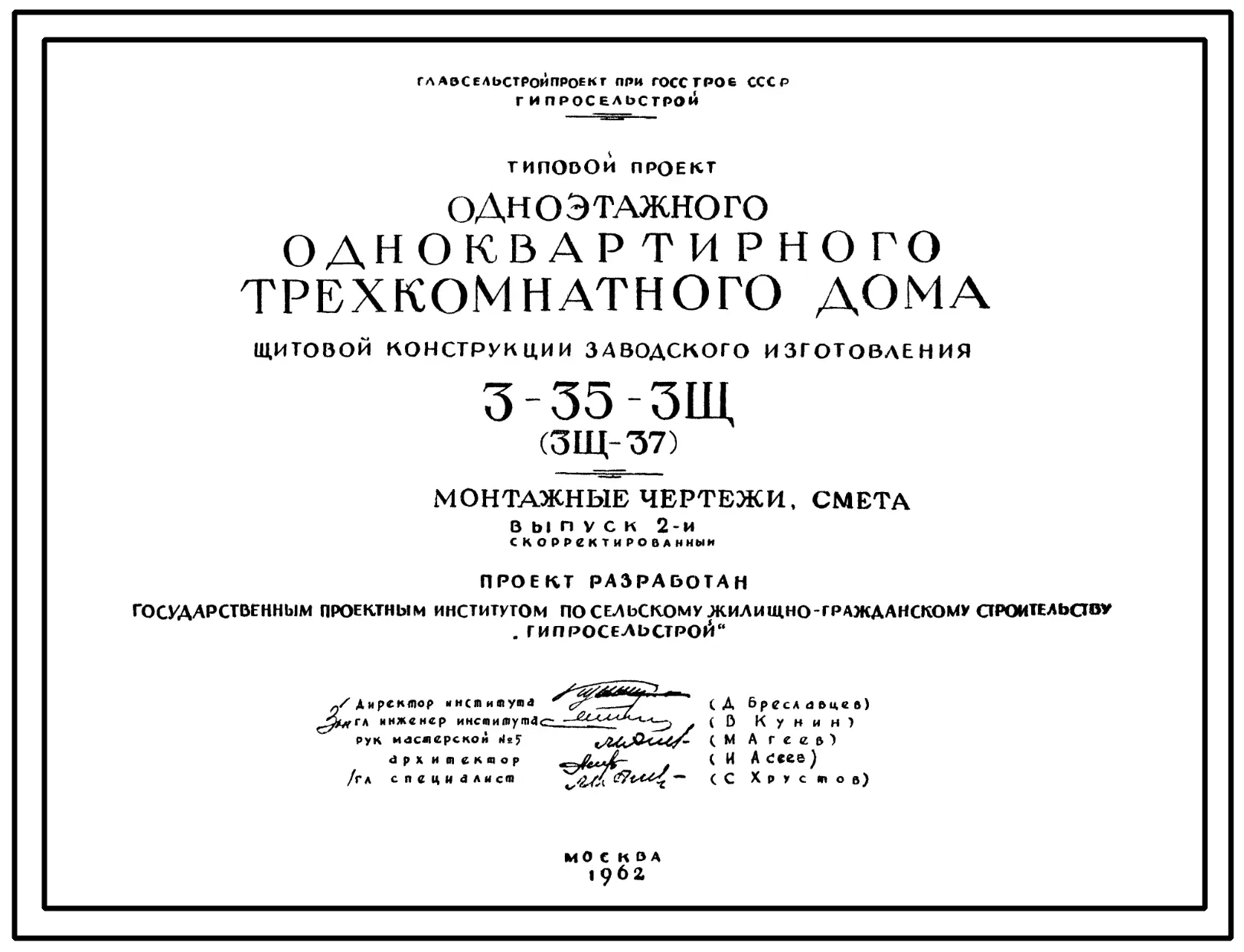 Типовой проект 3-35-3Щ(3Щ-37) Одноэтажный одноквартирный трехкомнатный дом щитовой конструкции заводского изготовления