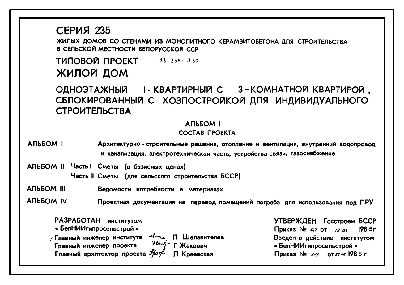 Типовой проект 188-235-17.86 Жилой дом 1-этажный 1-квартирный с 3-комнатной квартирой, сблокированный с хозпостройкой, для индивидуального строительства. Паспорт проекта (формат PDF) Чертежи (формат TIF)