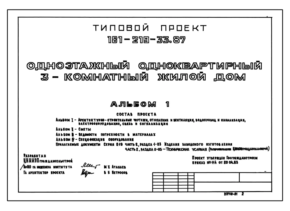 Типовой проект 181-219-33.87 Одноэтажный одноквартирный 3-комнатный жилой дом. Стены несущие панели с деревянным каркасом. Паспорт проекта (формат PDF) Чертежи (формат TIF)