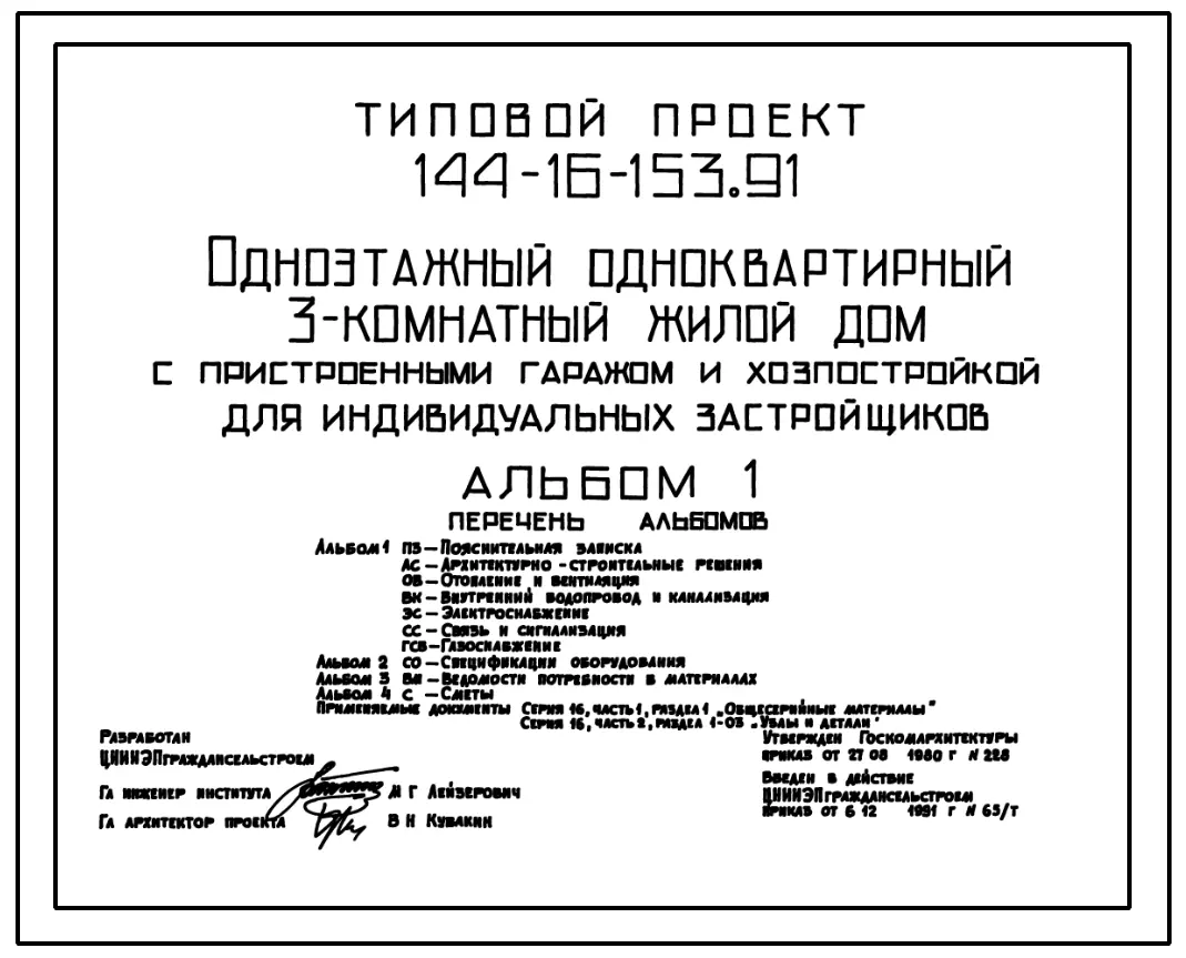 Типовой проект 144-16-153.91 Одноэтажный одноквартирный 3-комнатный жилой дом с пристроенными гаражом и хозпостройкой для индивидуальных застройщиков. Чертежи (формат TIF) Паспорт проекта (формат PDF)