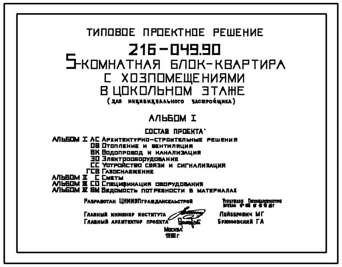 Типовой проект 216-049.90 5-комнатная блок-квартира с хозпомещениями в цокольном этаже (для индивидуального застройщика). Паспорт проекта (формат PDF) Чертежи (формат TIF)