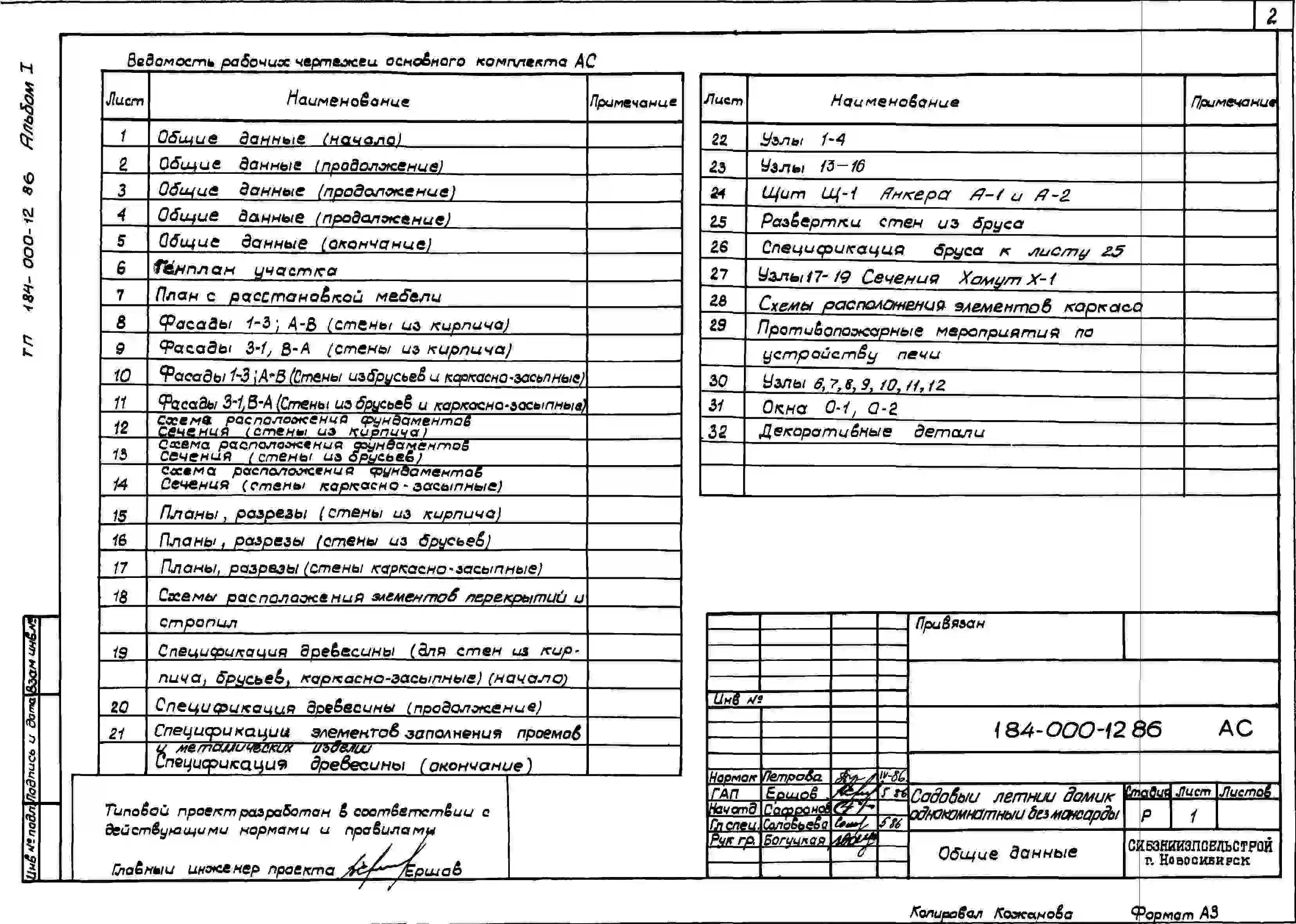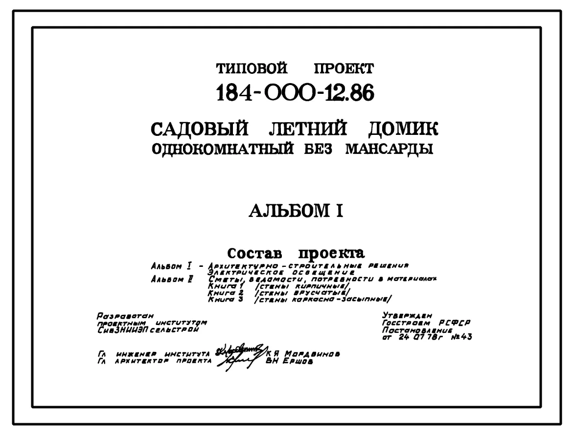 Типовой проект 184-000-12.86 Однокомнатный летний садовый домик. Площадь, м2: общая 14,8, веранды 9,5. Паспорт проекта (формат PDF) Чертежи (формат TIF)