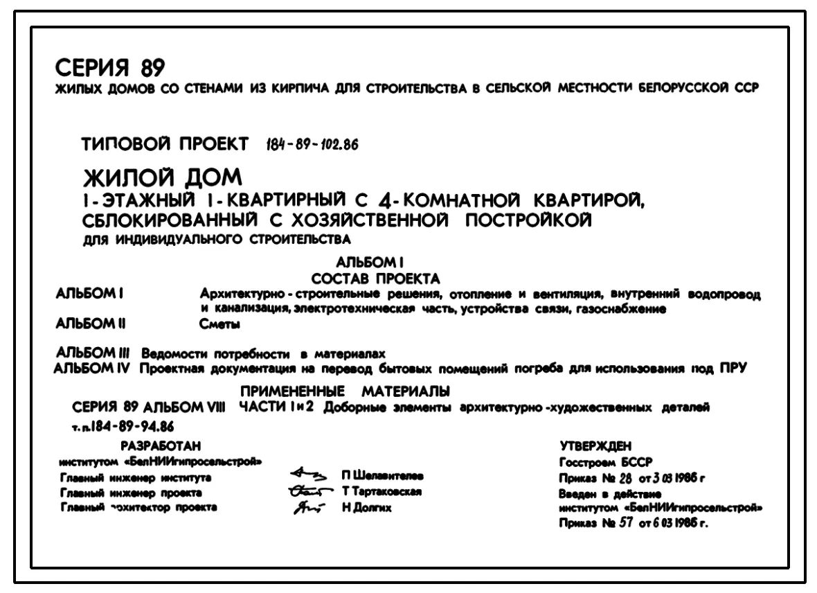 Типовой проект 184-89-102.86 Одноэтажный жилой дом с четырехкомнатной квартирой типа 4Б, сблокированный с хозпостройкой, для индивидуального строительства. Паспорт проекта (формат PDF) Чертежи (формат TIF)