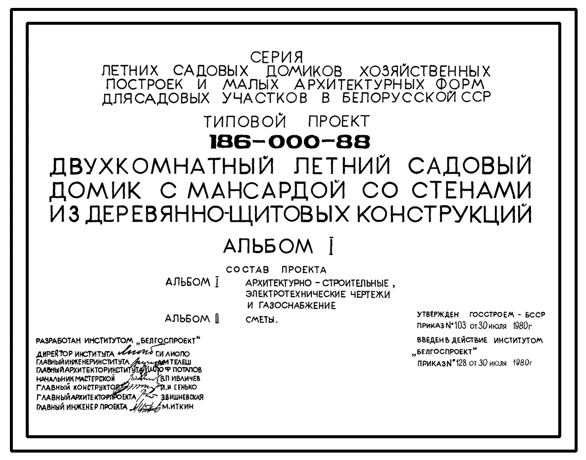 Типовой проект 186-000-88 Двухкомнатный летний садовый домик с мансардой со стенами из деревянно-щитовых конструкций. Чертежи (формат TIF)