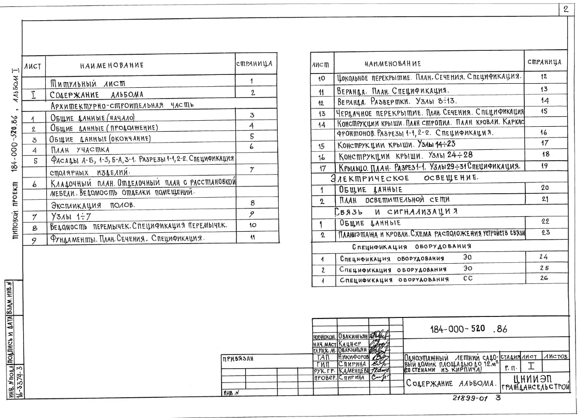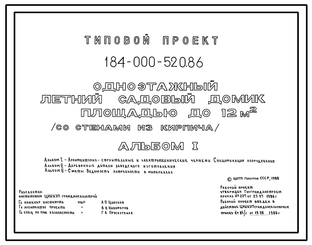 Типовой проект 184-000-520.86 Однокомнатный летний садовый домик. Площадь, м2: общая 10,6, веранды 9,3. Чертежи (формат TIF) Паспорт проекта (формат PDF)