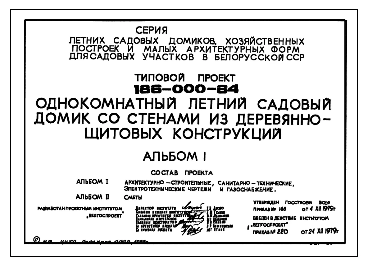 Типовой проект 186-000-64 Одноэтажный однокомнатный садовый летний домик. Для строительства во 2 климатическом районе. Паспорт проекта (формат PDF) Чертежи (формат TIF)