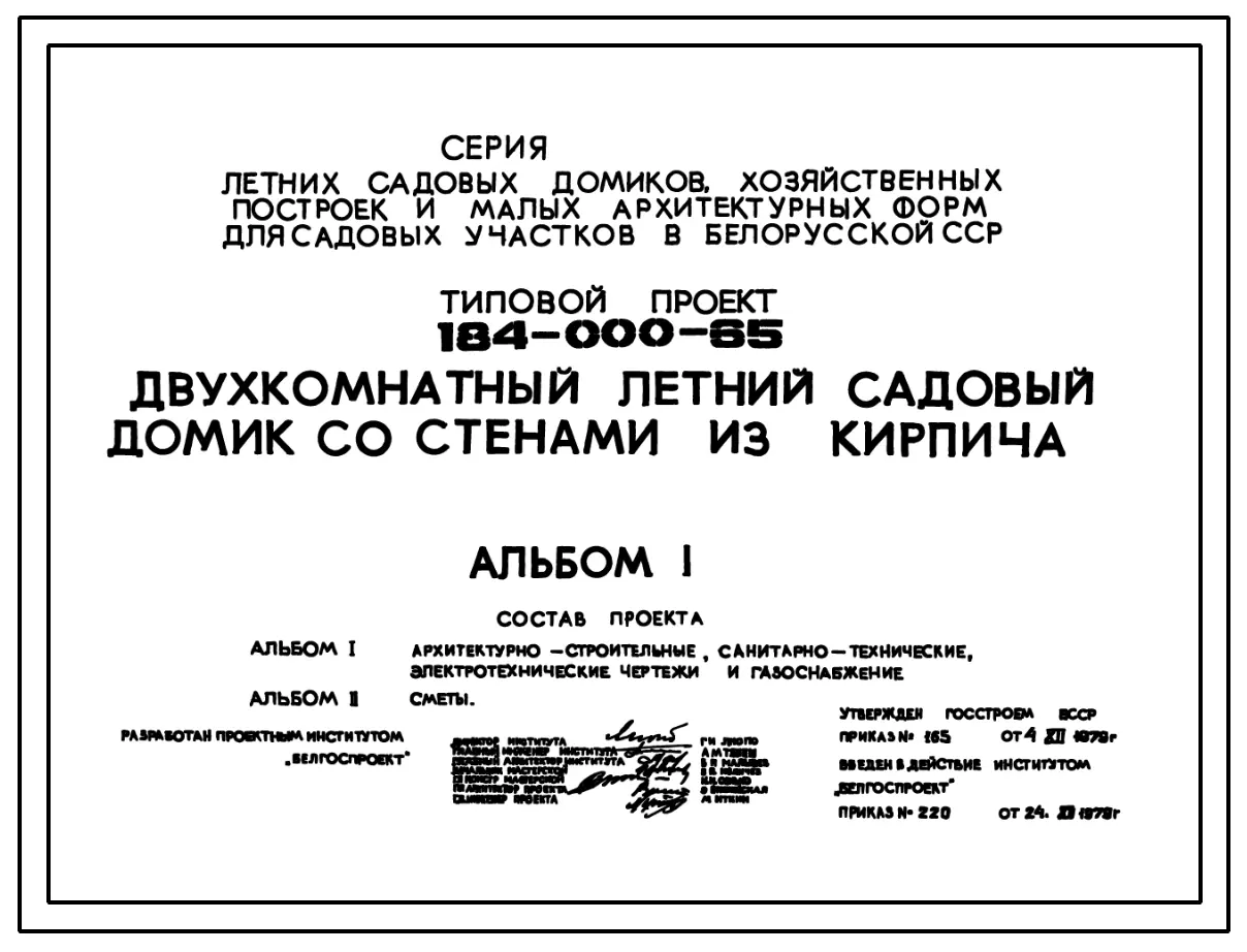 Типовой проект 184-000-65 Двухкомнатный садовый летний домик. Для строительства во 2 климатическом районе. Паспорт проекта (формат PDF) Чертежи (формат TIF)