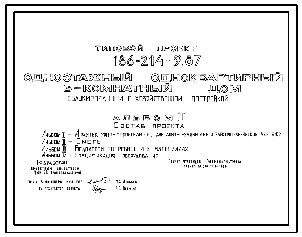 Типовой проект 186-214-9.87 Дом с трехкомнатной квартирой, сблокированный с хозяйственной постройкой. Общая площадь квартиры 97 м2 (СТЕНЫ РУБЛЕНЫЕ ДЕРЕВЯННЫЕ С ВНУТРЕННЕЙ ОБШИВКОЙ ГИПСОКАРТОННЫМИ ЛИСТАМИ, Одноэтажные, Мансардные). Паспорт проекта (формат PDF) Чертежи (формат TIF)
