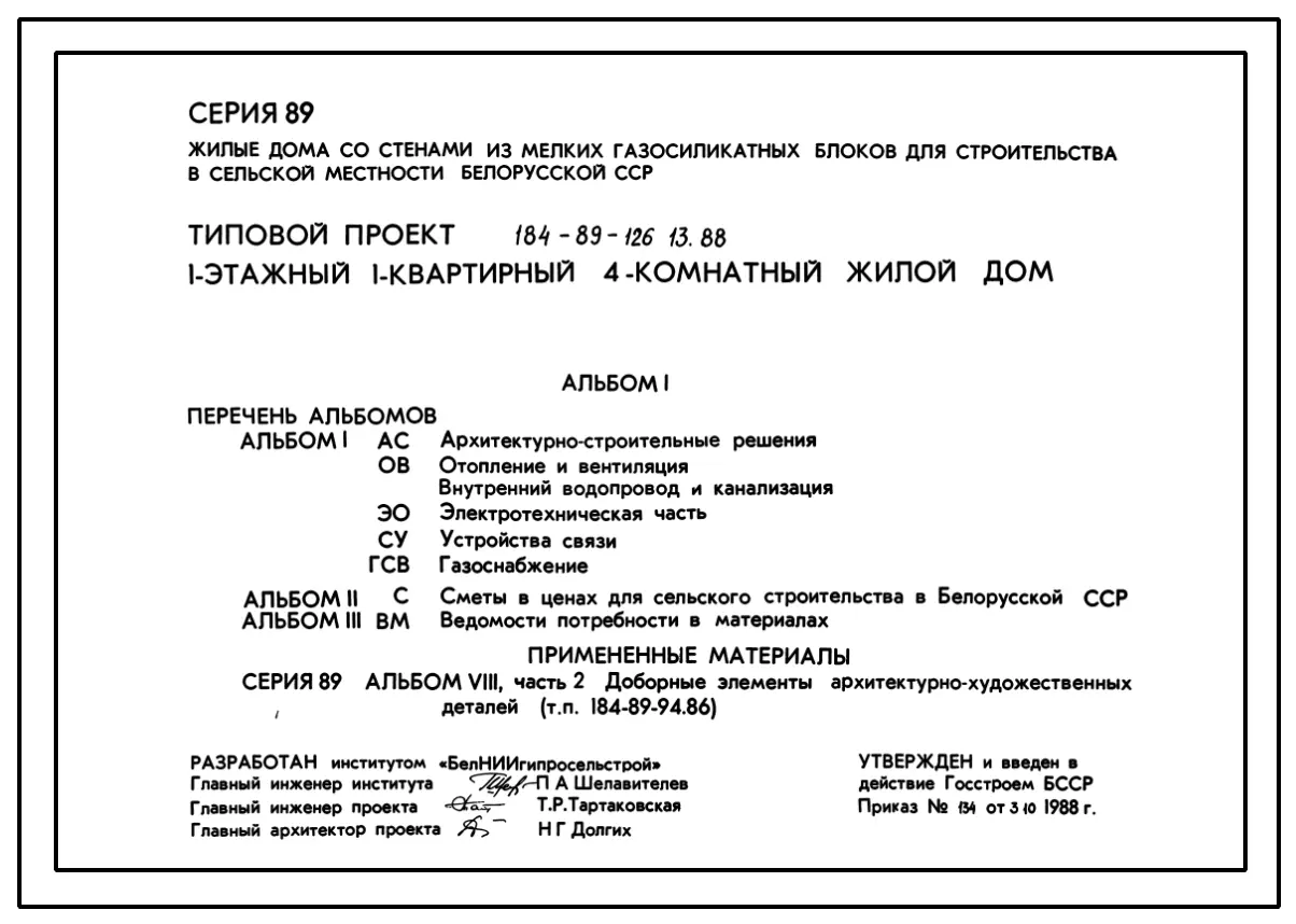 Типовой проект 184-89-126.13.88 Дом одноэтажный с четырехкомнатной квартирой. Для Белорусской ССР. Паспорт проекта (формат PDF) Чертежи (формат TIF)