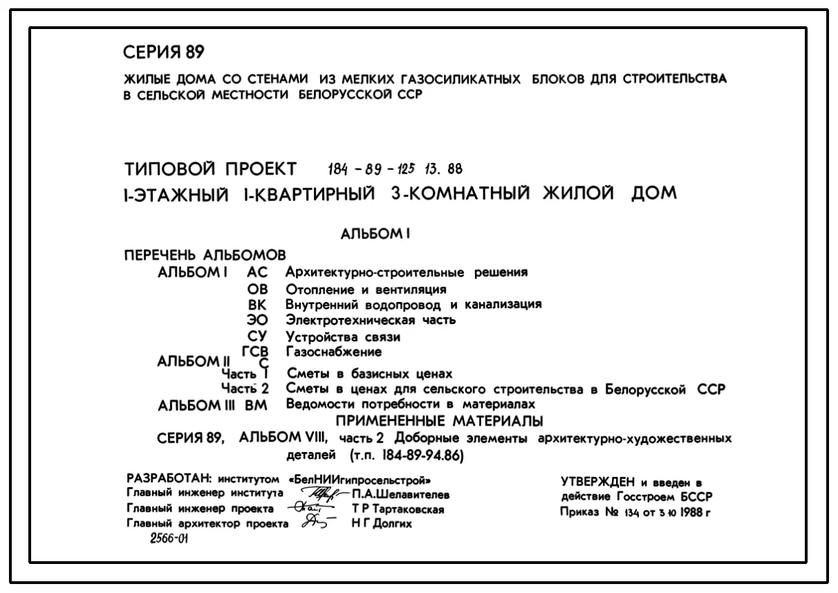 Типовой проект 184-89-125.13.88 Дом одноэтажный с трехкомнатной квартирой. Для Белорусской ССР. Паспорт проекта (формат PDF) Чертежи (формат TIF)