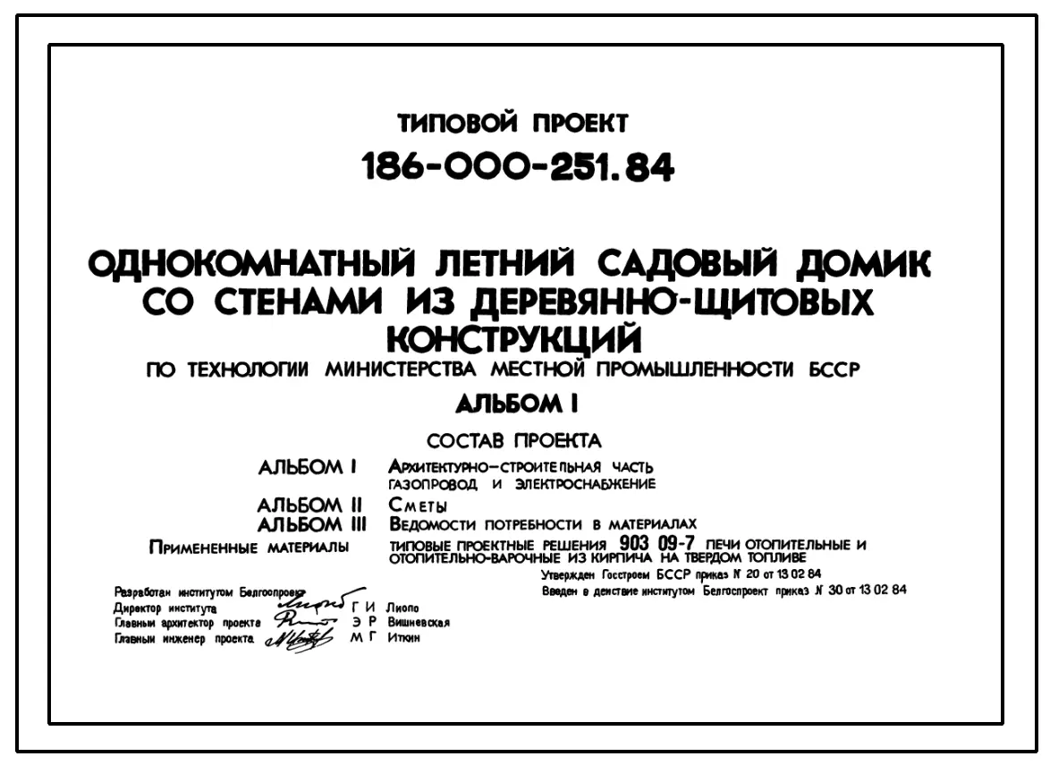 Типовой проект 186-000-251.84 1-этажный летний садовый домик со стенами из деревянно-щитовых конструкций. Для строительства во 2В климатическом подрайоне Белорусской ССР.. Паспорт проекта (формат PDF) Чертежи (формат TIF)