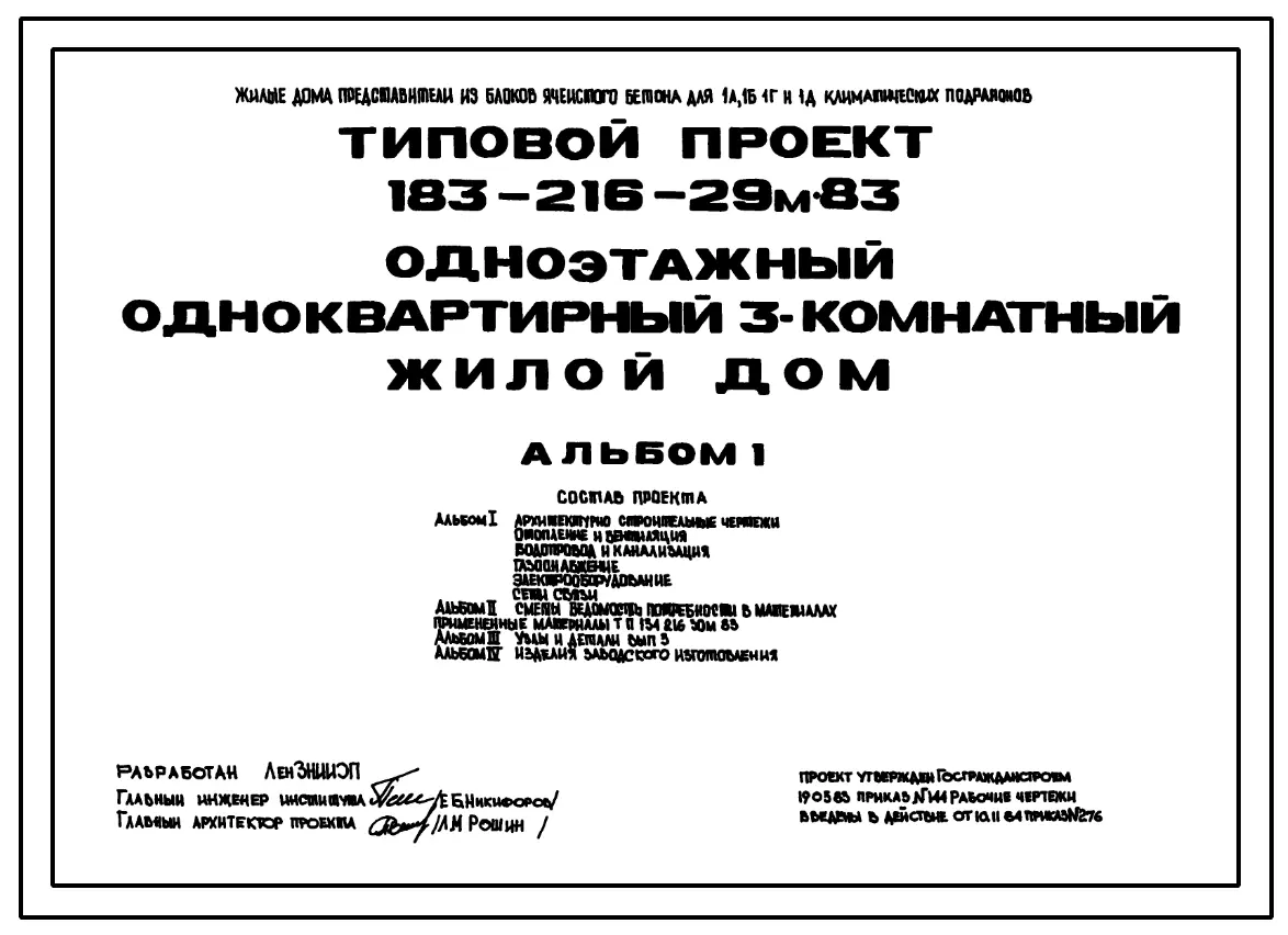 Типовой проект 183-216-29м.85 1-этажный 1-квартирный 3-комнатный жилой дом. Для строительства в 1А,1Б,1Г,1Д климатических подрайонах с вечномерзлыми грунтами, используемыми по принципу 1.. Паспорт проекта (формат PDF) Чертежи (формат TIF)