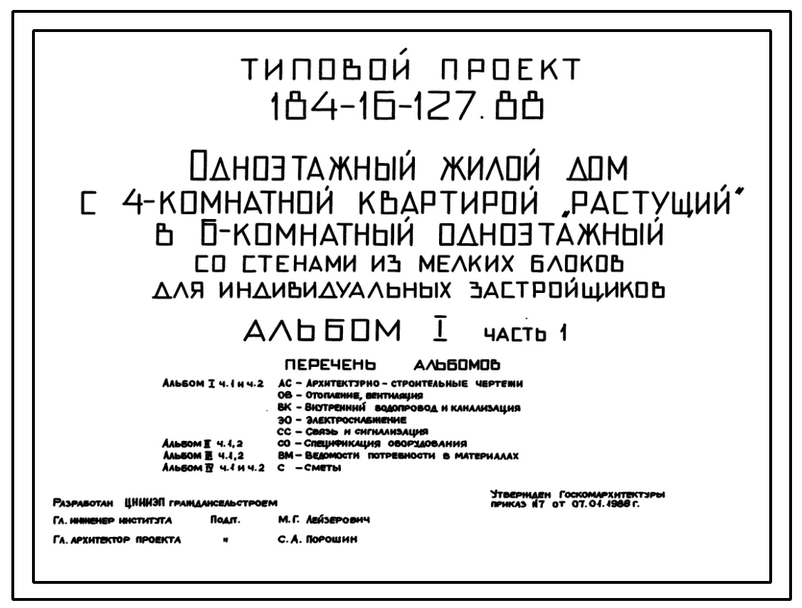 Типовой проект 184-16-127.88 Одноэтажный жилой дом с 4-комнатной квартирой "растущий" в 6-комнатный одноэтажный со стенами из мелких блоков для индивидуальных застройщиков. Паспорт проекта (формат PDF) Чертежи (формат TIF)