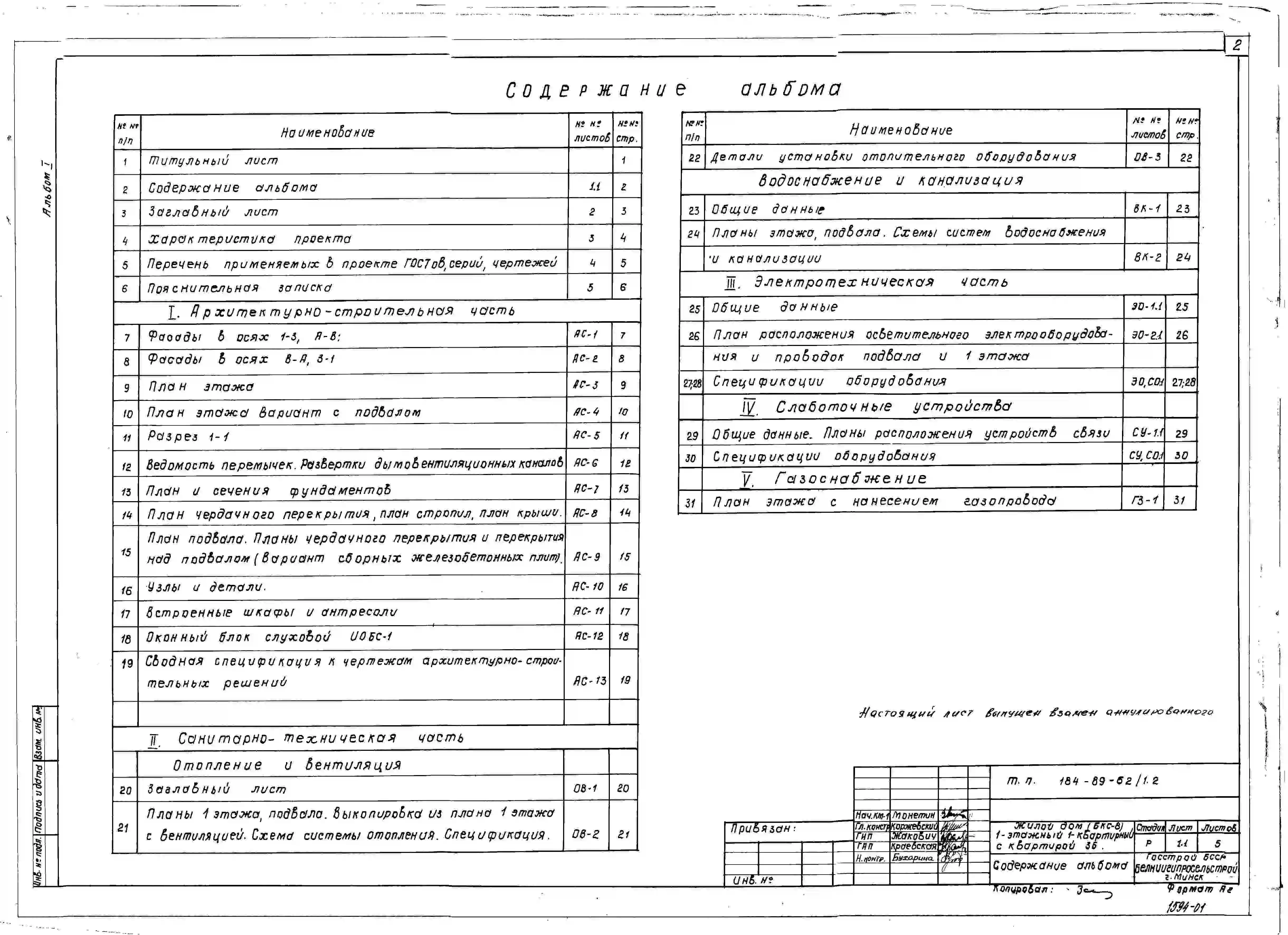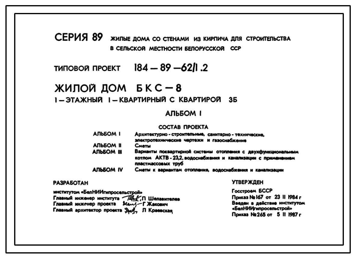 Типовой проект 184-89-62/1.2 Жилой дом (БКС-8) 1-этажный 1-квартирный с квартирой 3Б. Паспорт проекта (формат PDF) Чертежи (формат TIF)