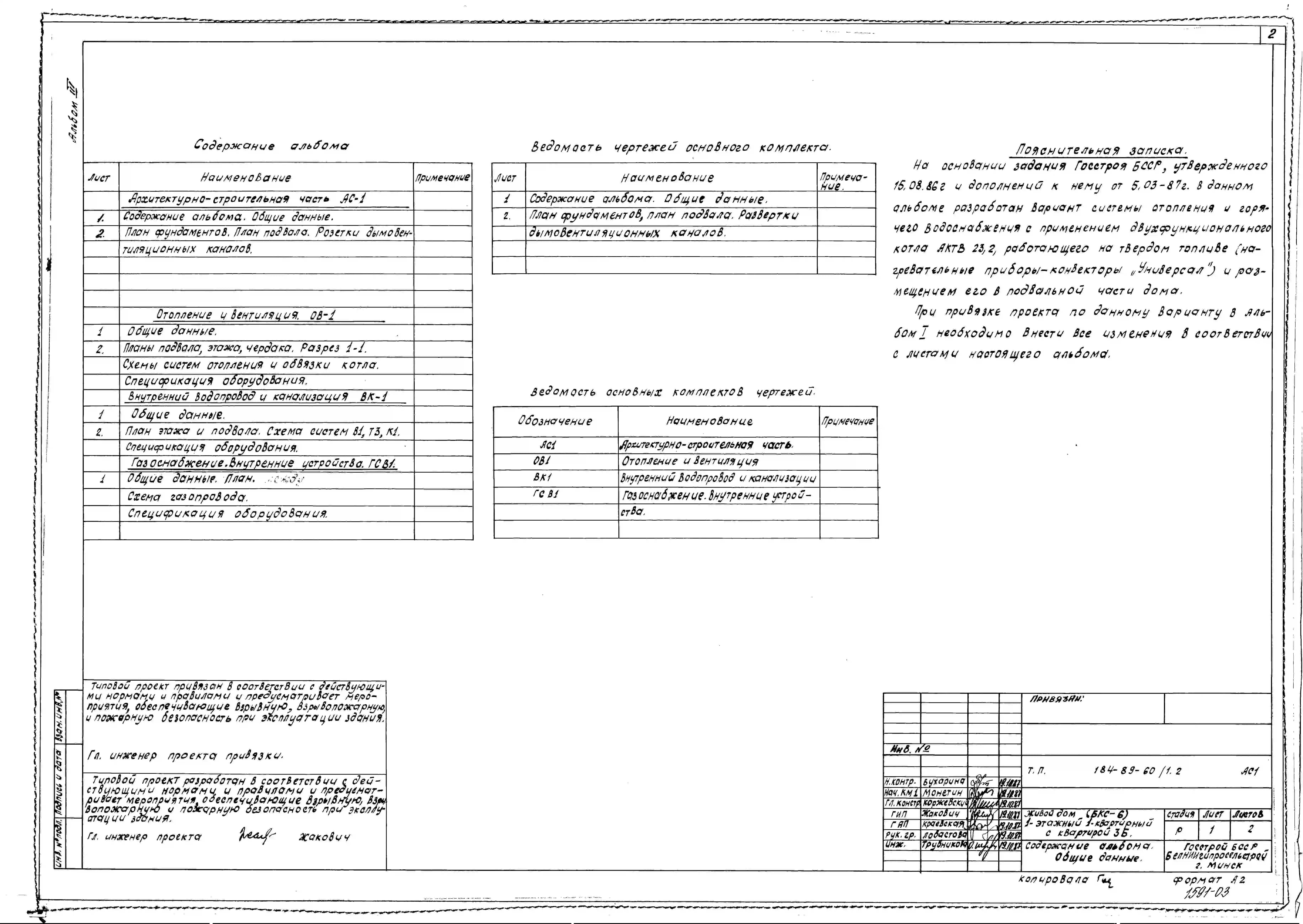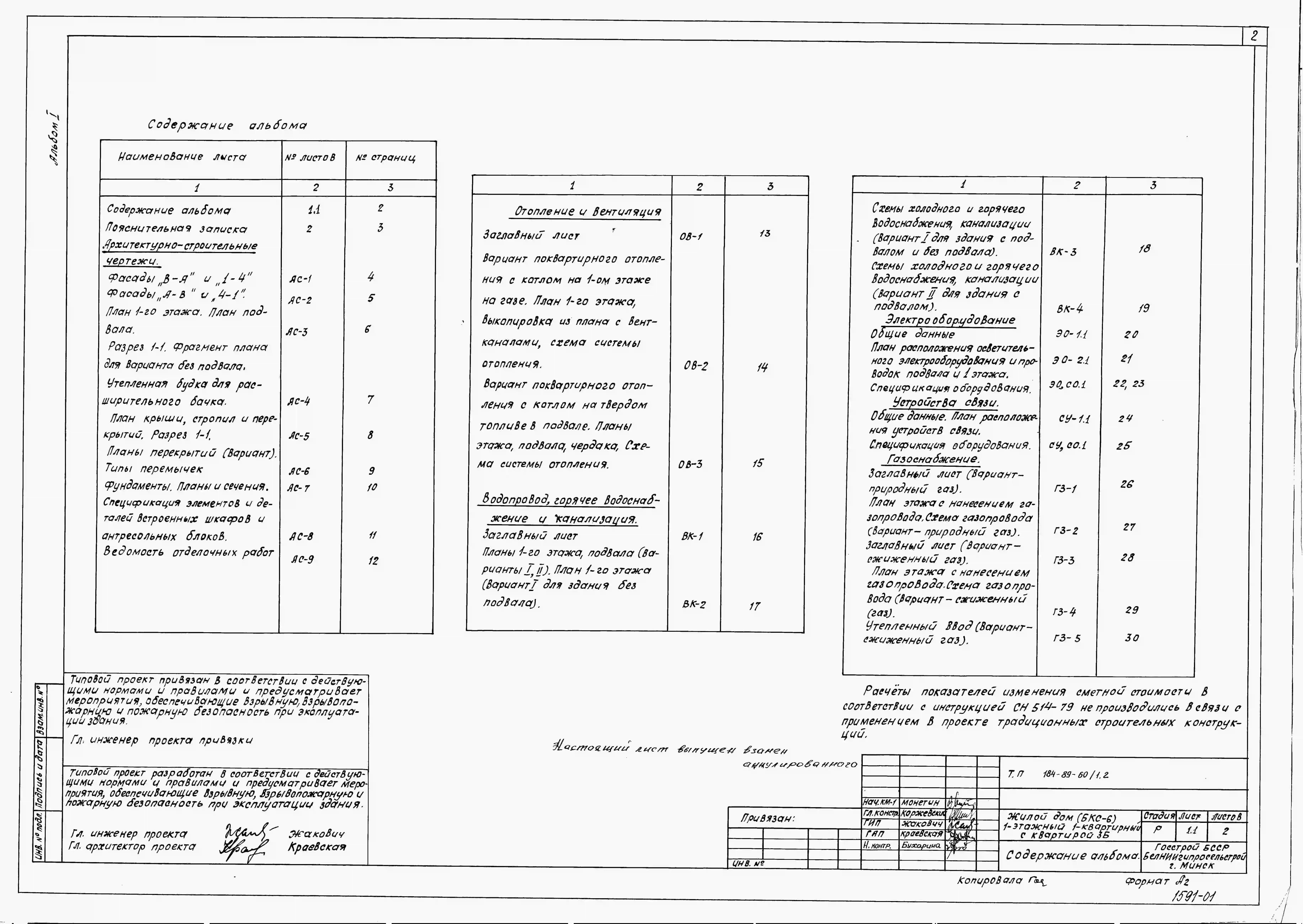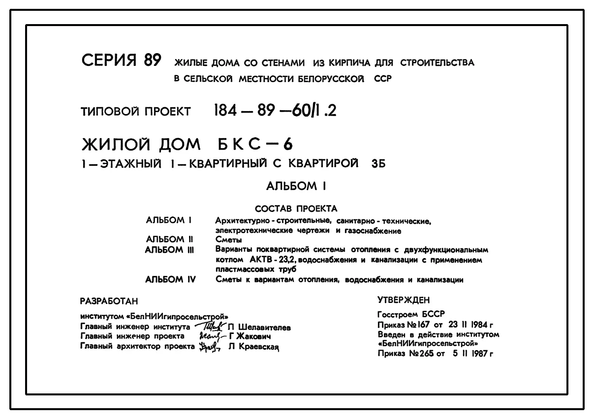 Типовой проект 184-89-60/1.2 Жилой дом (БКС-6) 1-этажный 1-квартирный с квартирой 3Б. Паспорт проекта (формат PDF) Чертежи (формат TIF)
