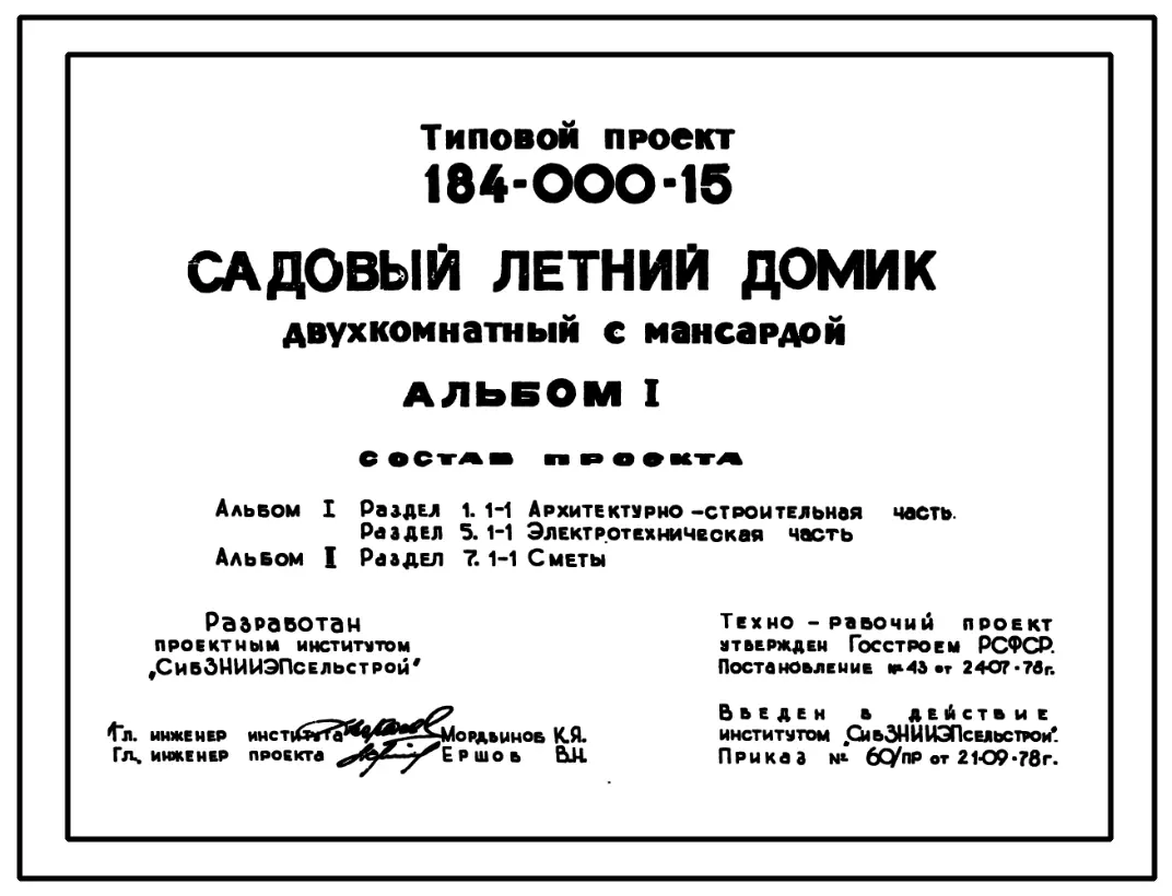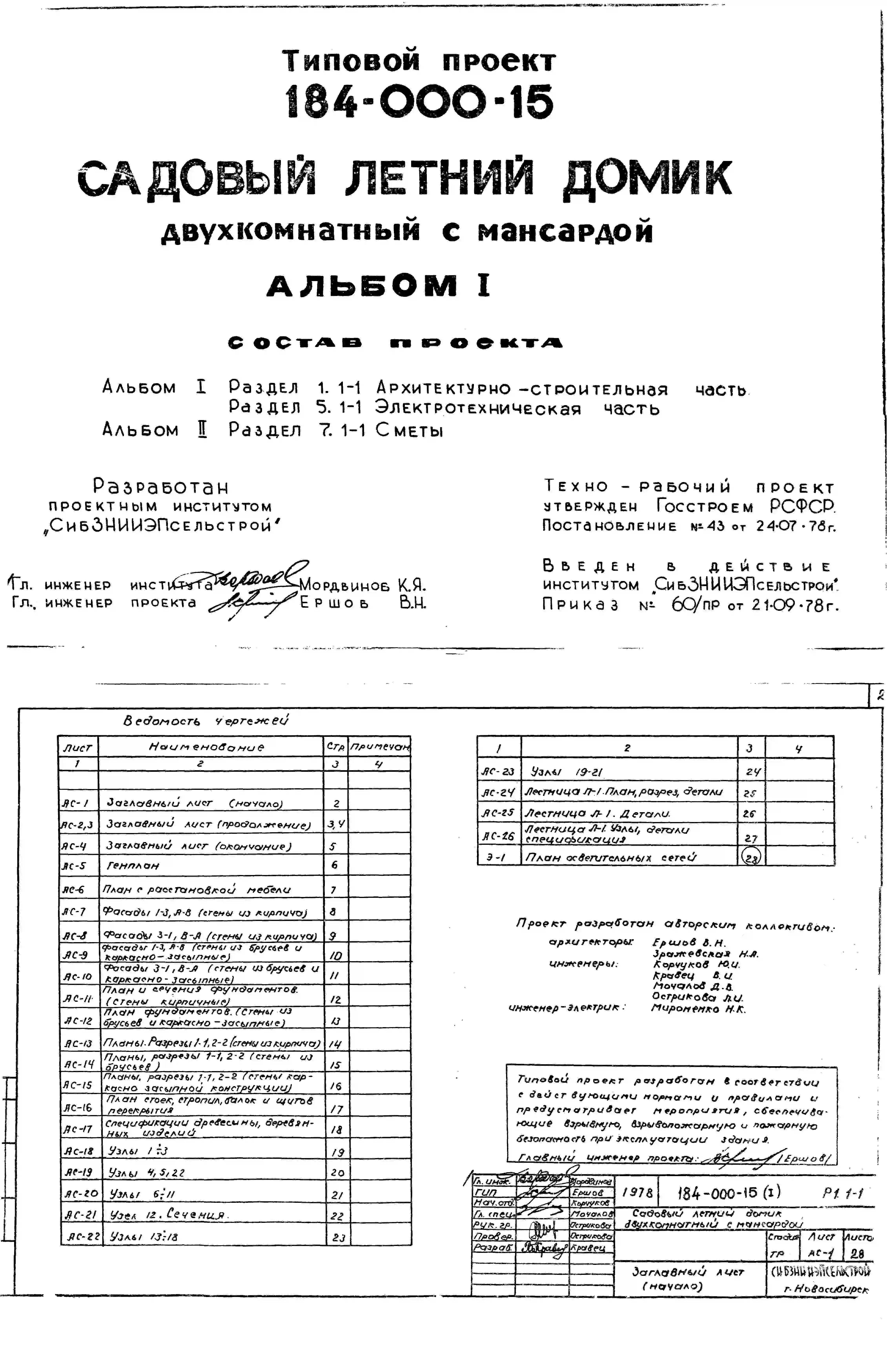 Типовой проект 184-000-15 Садовый летний домик двухкомнатный с мансардой. Паспорт проекта (формат PDF) Чертежи (формат TIF)