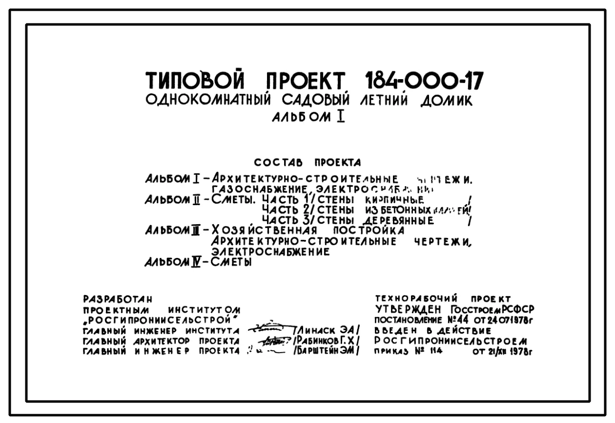 Типовой проект 184-000-17 Однокомнатный садовый летний домик. Для строительства во II климатическом районе.. Паспорт проекта (формат PDF) Чертежи (формат TIF)