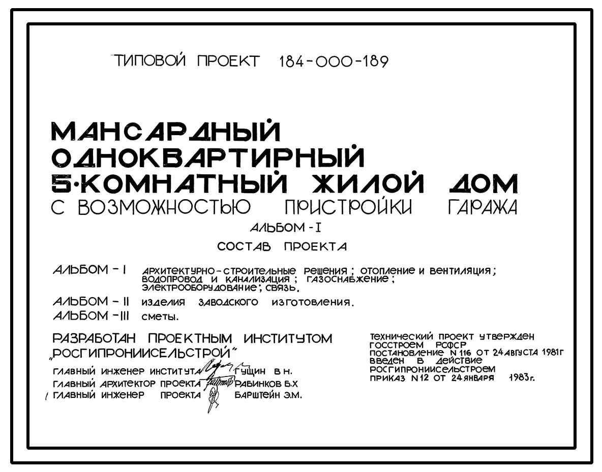 Типовой проект 184-000-189 Мансардный одноквартирный 5-комнатный жилой дом с возможностью пристройки гаража (для индивидуальных застройщиков). Паспорт проекта (формат PDF) Чертежи (формат TIF)