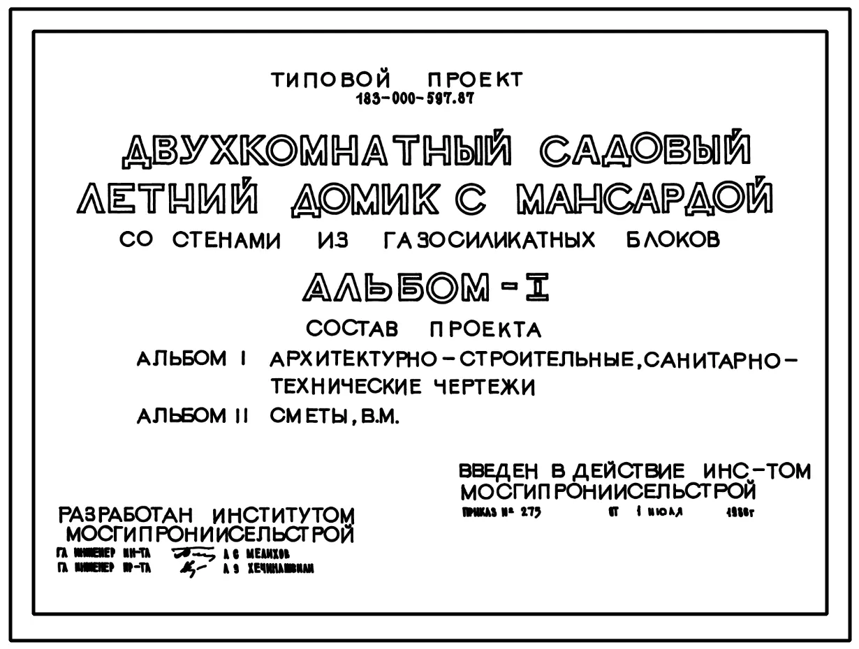 Типовой проект 183-000-597.87 Двухкомнатный садовый летний домик с мансардой. Площадь, м2: общая 23,6, мансарды 15,0, веранды 10,0 . Стены из газосиликатных блоков. Паспорт проекта (формат PDF) Чертежи (формат TIF)