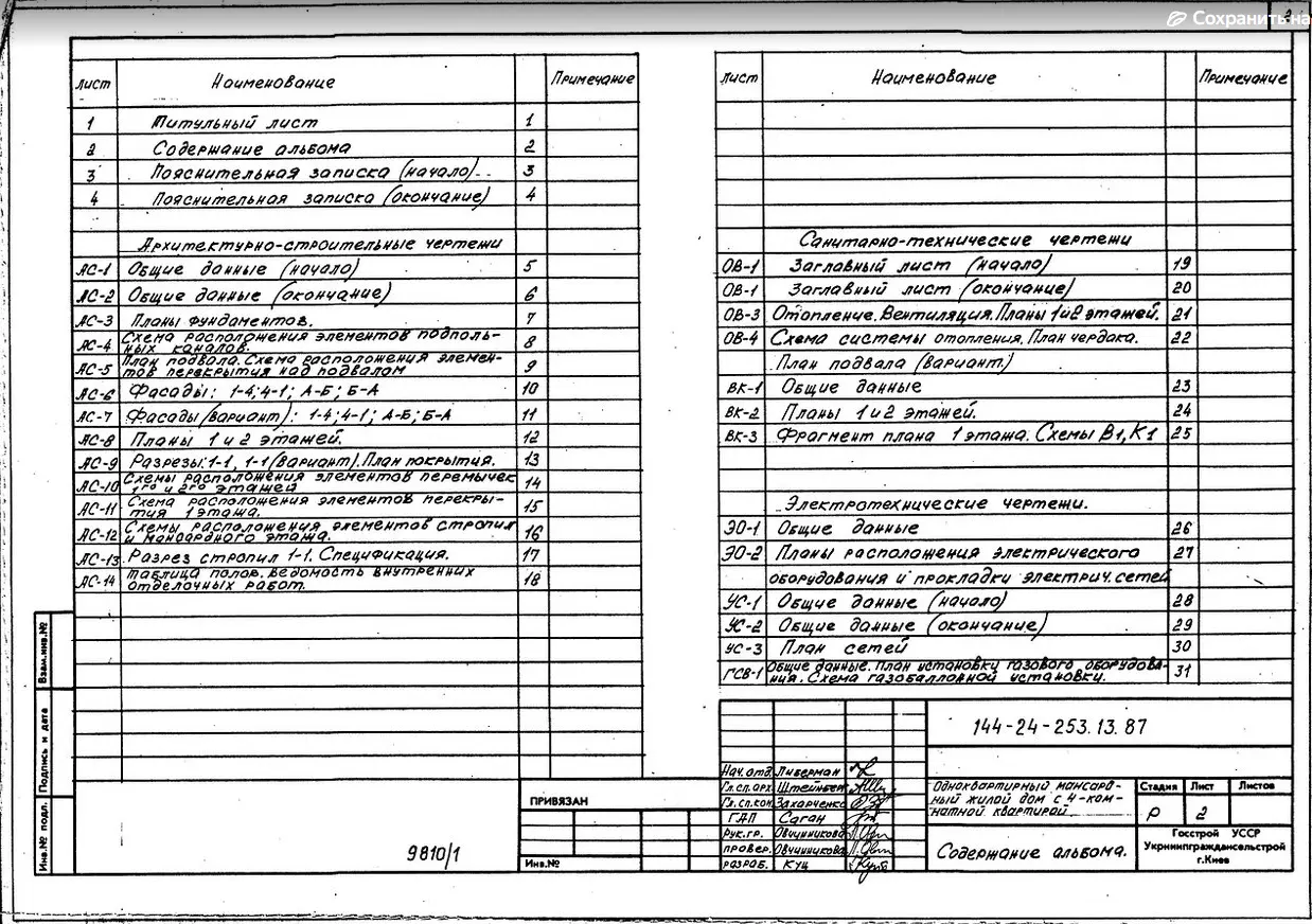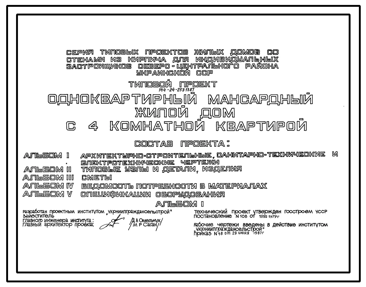 Типовой проект 144-24-253.13.87 Мансардный одноэтажный дом с четырехкомнатной квартирой. Для индивидуального строительства в северо-центральном регионе Украинской ССР. Чертежи (формат TIF)