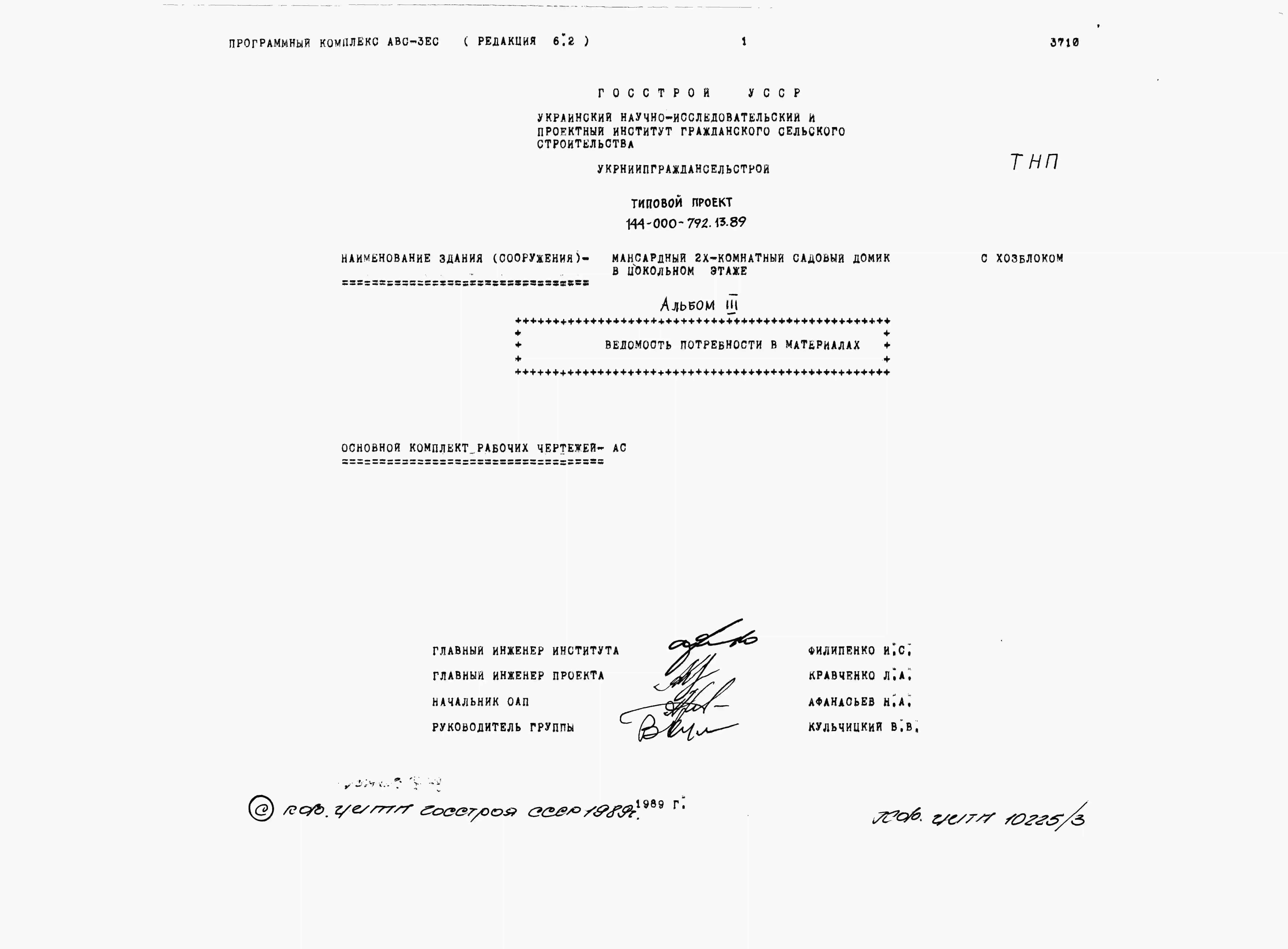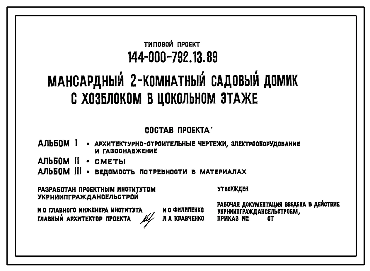 Типовой проект 144-000-792.13.89 Мансардный 2-комнатный садовый домик с хозблоком в цокольном этаже. Паспорт проекта (формат PDF) Чертежи (формат TIF)