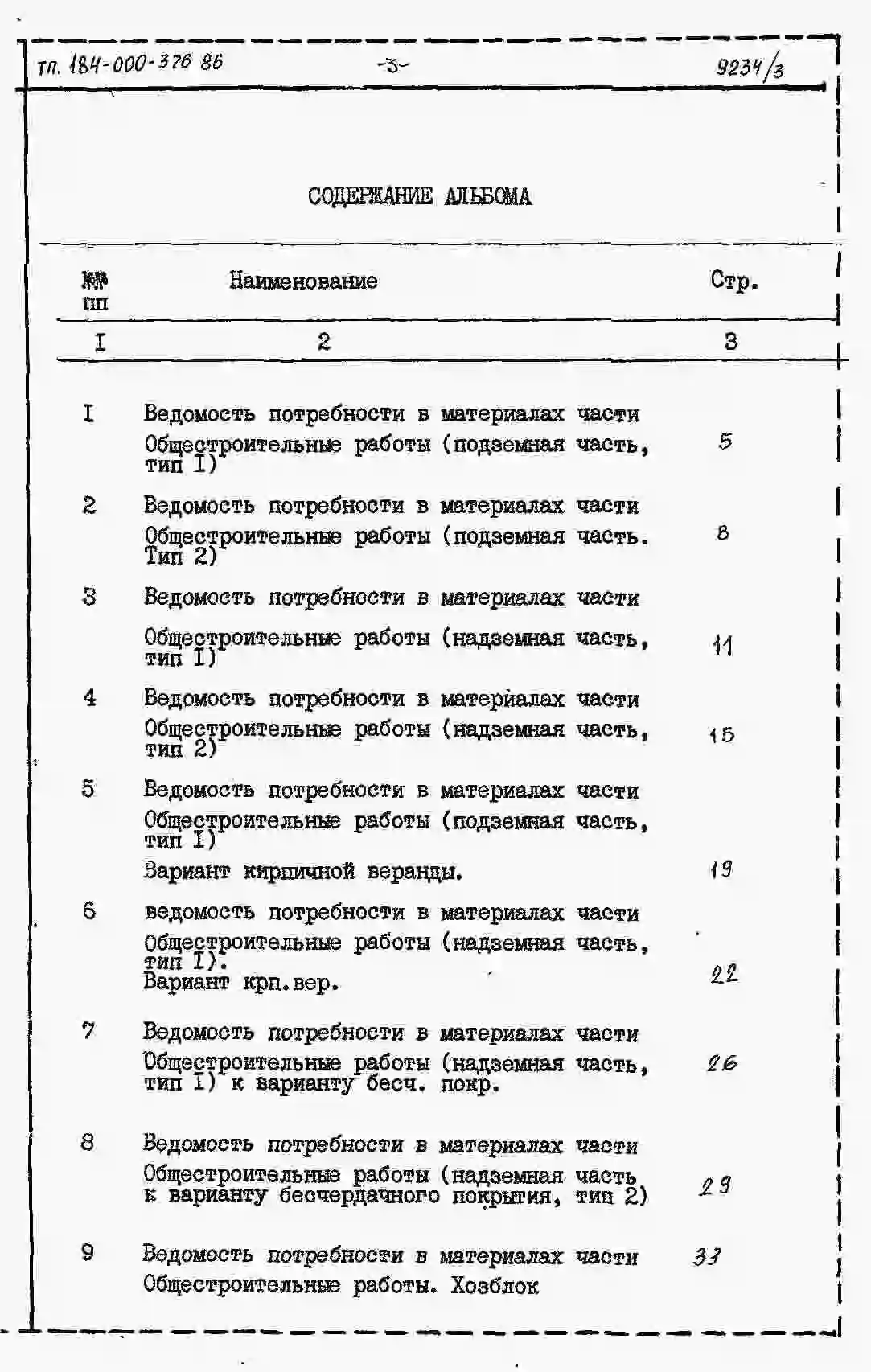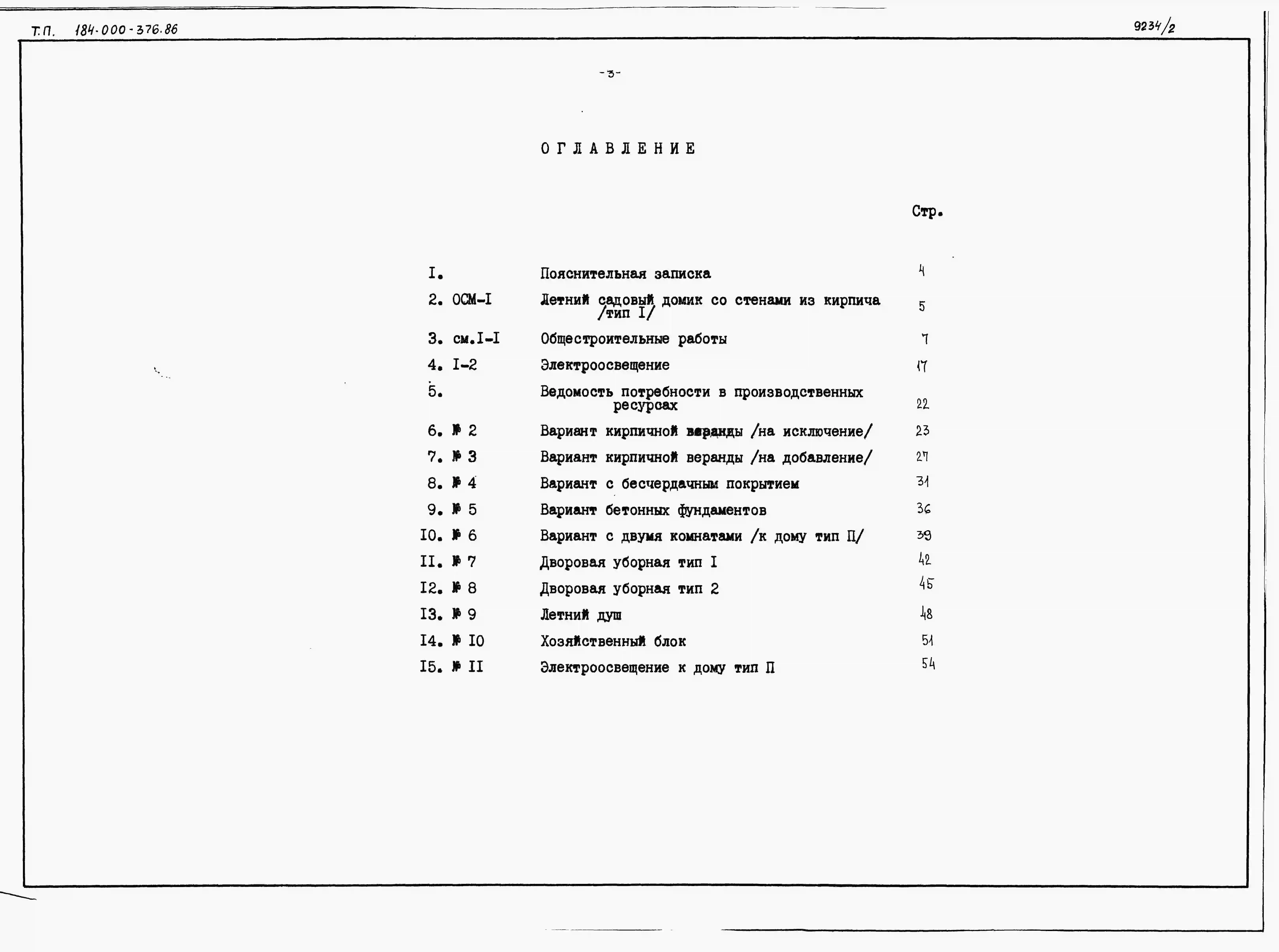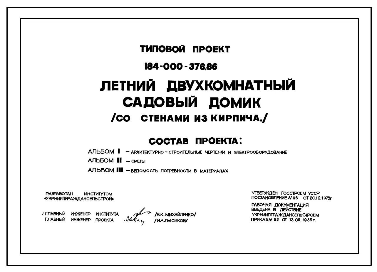 Типовой проект 184-000-376.86 Летний двухкомнатный садовый домик (со стенами из кирпича). Паспорт проекта (формат PDF) Чертежи (формат TIF)