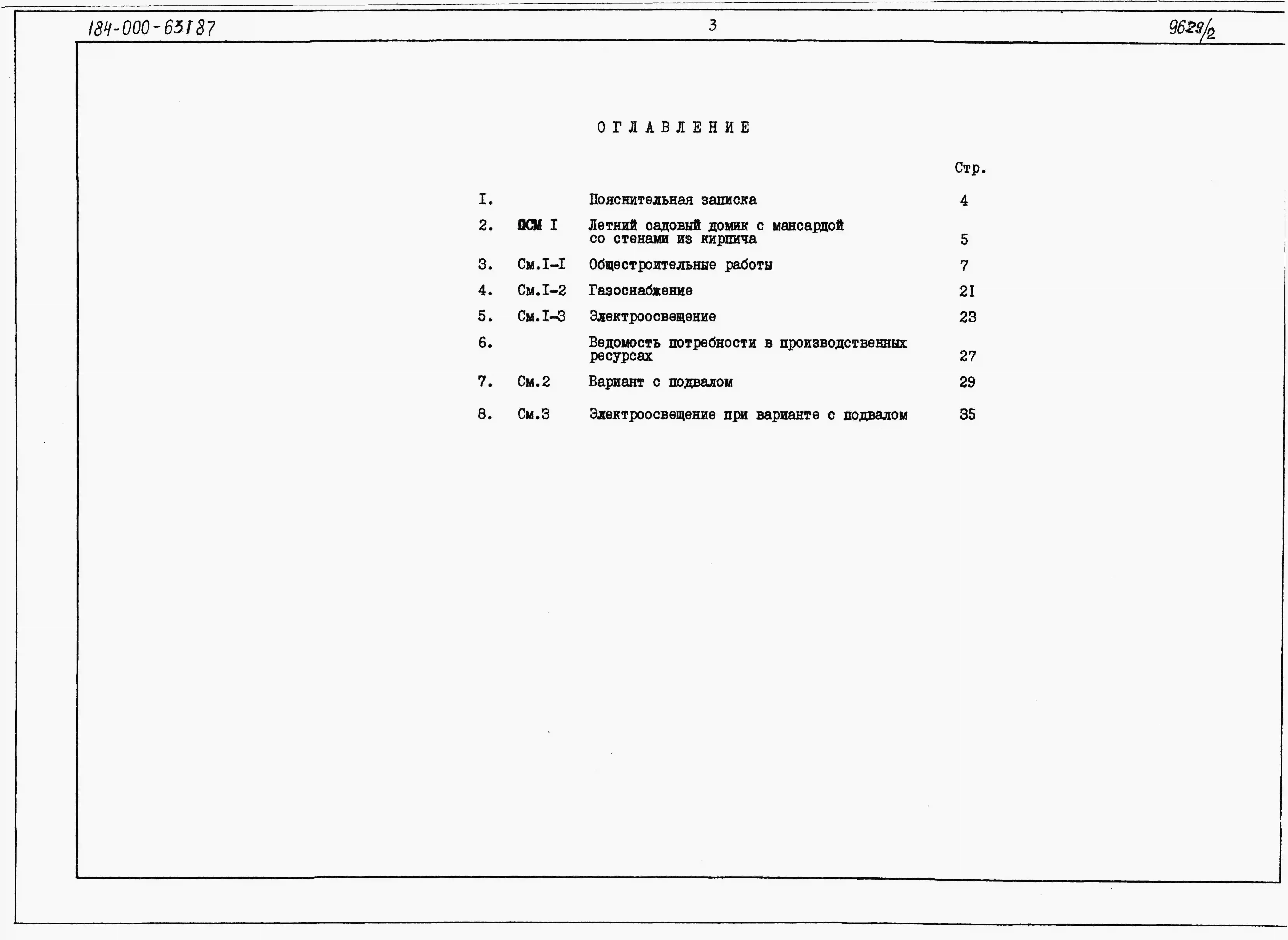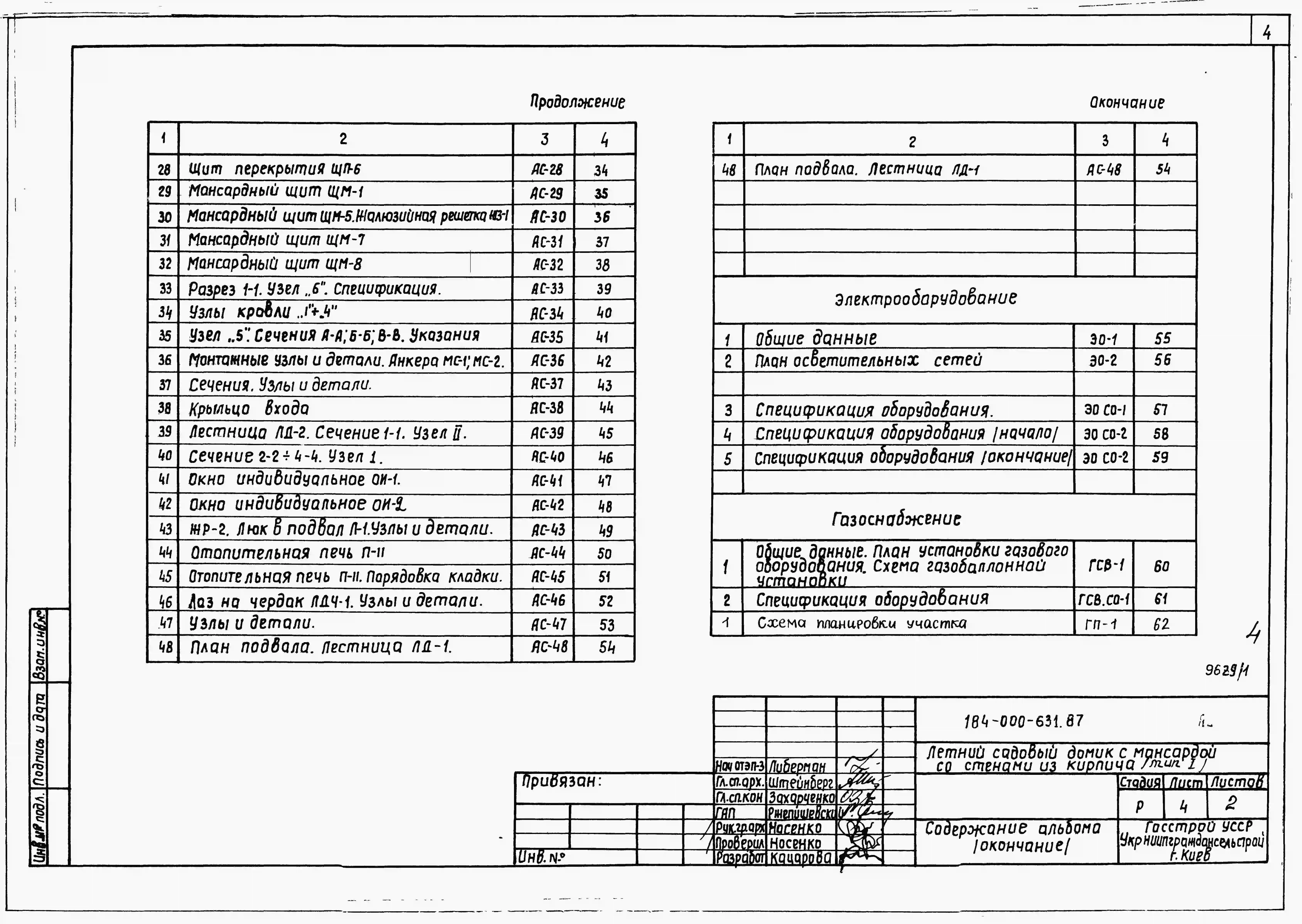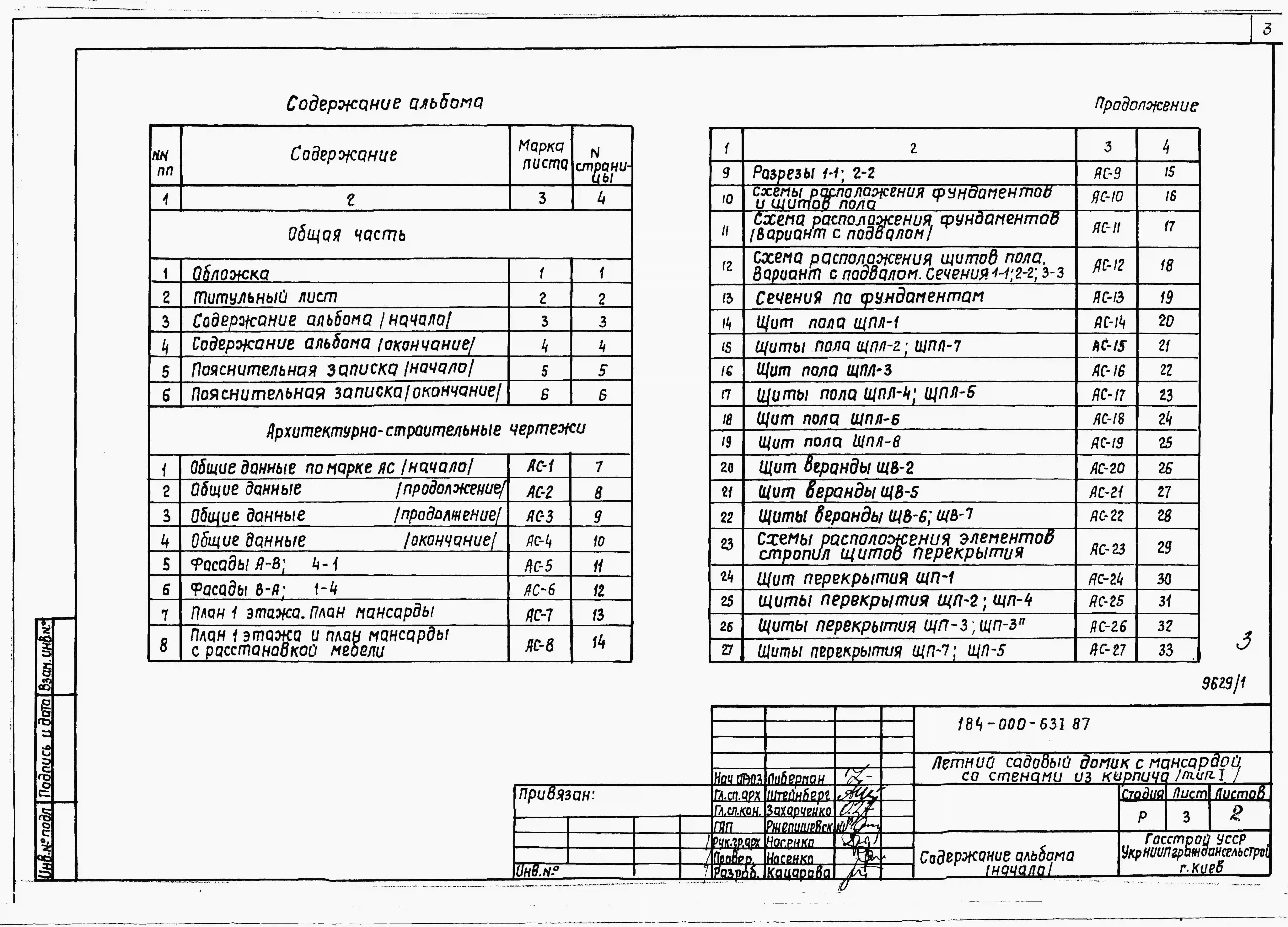 Типовой проект 184-000-631.87 Летний садовый домик с мансардой со стенами из кирпича (тип 1). Паспорт проекта (формат PDF) Чертежи (формат TIF)