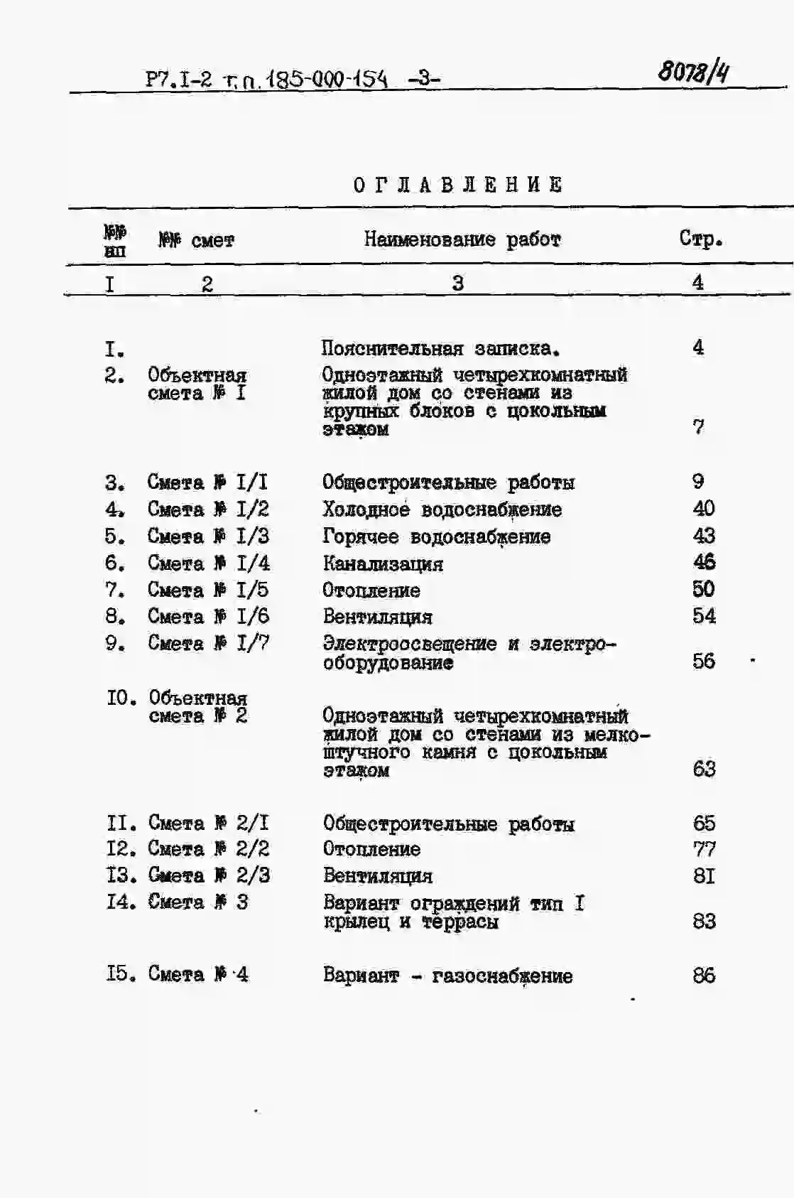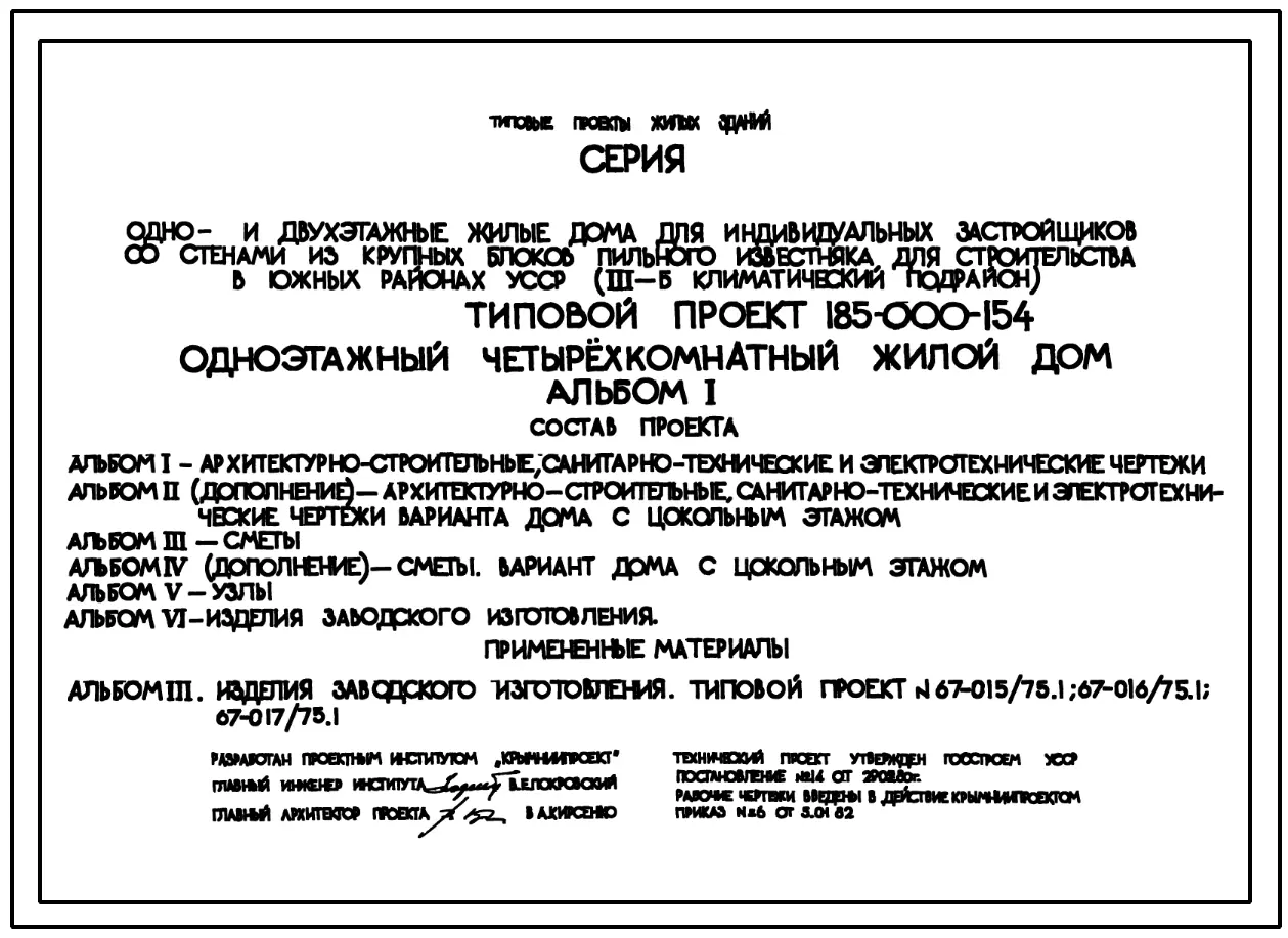 Типовой проект 185-000-154 Одноэтажный четырехкомнатный жилой дом. Стены их крупных блоков пильного известняка.. Паспорт проекта (формат PDF) Чертежи (формат TIF)