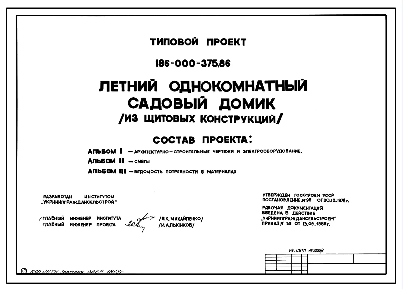Типовой проект 186-000-375.86 Летний однокомнатный садовый домик (из щитовых конструкций). Паспорт проекта (формат PDF) Чертежи (формат TIF)