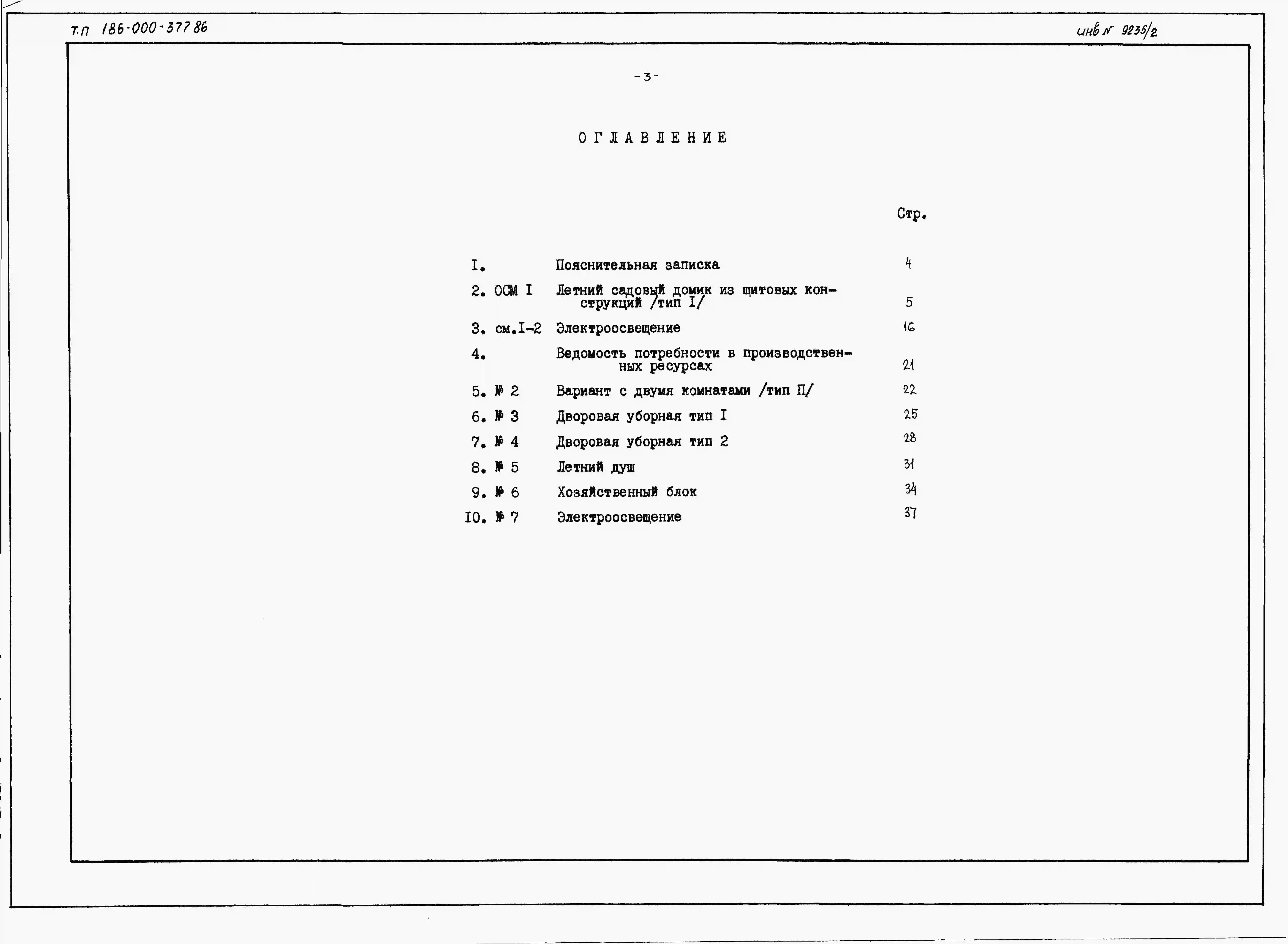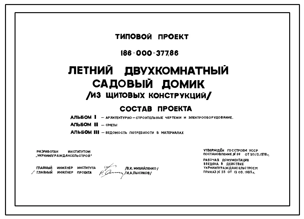Типовой проект 186-000-377.86 Летний двухкомнатный садовый домик (из щитовых конструкций). Паспорт проекта (формат PDF) Чертежи (формат TIF)