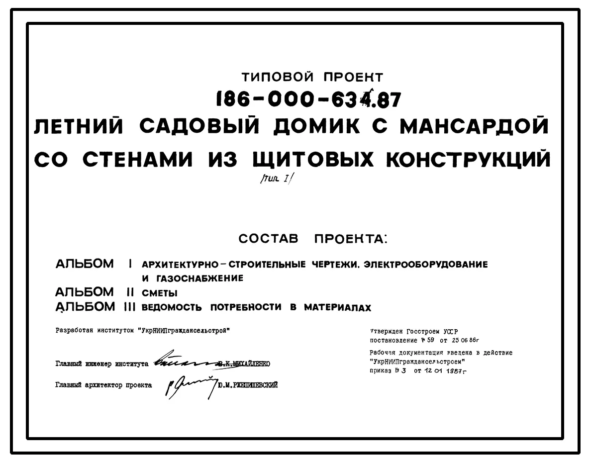 Типовой проект 186-000-634.87 Летний садовый домик с мансардой со стенами из щитовых конструкций (тип 1). Паспорт проекта (формат PDF) Чертежи (формат TIF)